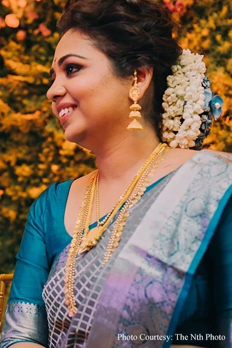 Layering multiple gold necklaces including a Kasu Mala that went seamlessly with her zari saree, bride and wedding planner Deepthi gave her traditional look a minimalistic twist with Tanishq’s jewellery. Paired with lightweight yet ornate jhumkas and flowers in her hair, Deepthi radiated her inner grace and confidence.