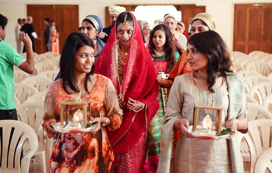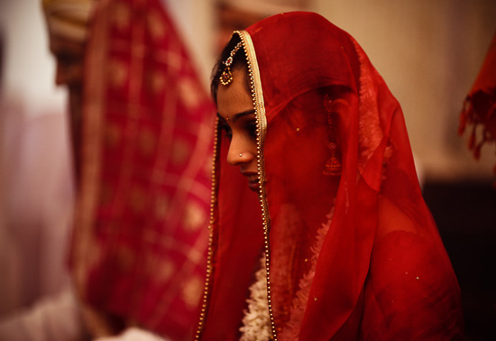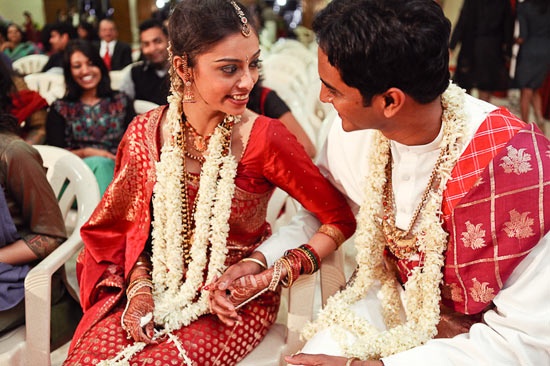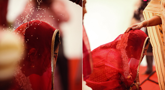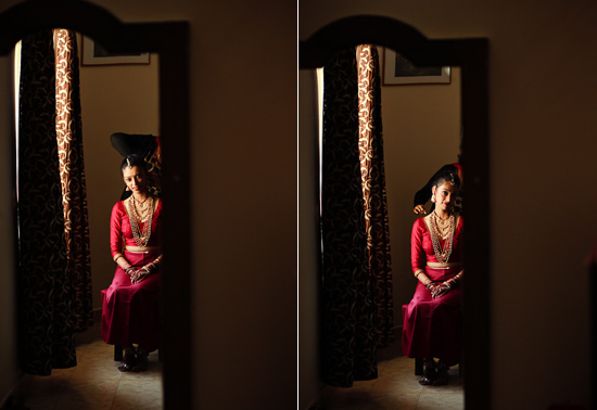 The bride wears a red silk sari with dots draped in the signature Coorgi style. Teamed with a red long-sleeved blouse and a red veil that covers her head. The sari is handed down as an heirloom