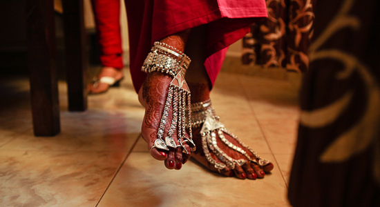 Gold jewellery is worn on the hair, ears, wrists, fingers and neck. Silver jewellery for the feet and a jasmine garland complete the look