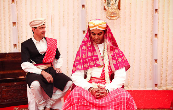 They worship their ancestors and therefore there is no priest. After the honour of cutting the banana plant stems, an elder guides the families through some rituals. The rest of the ceremony is family and friends blessing the couple with rice