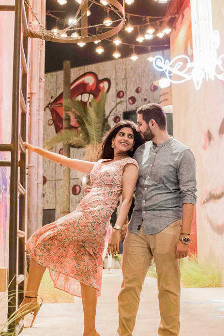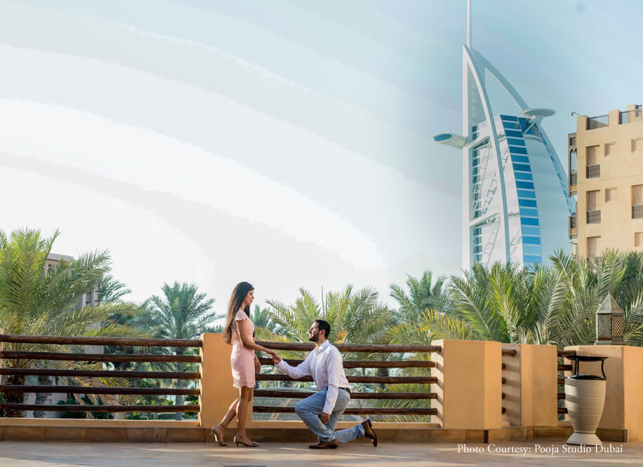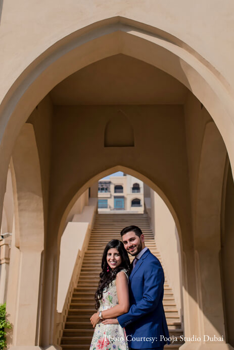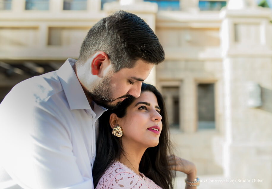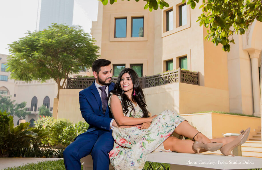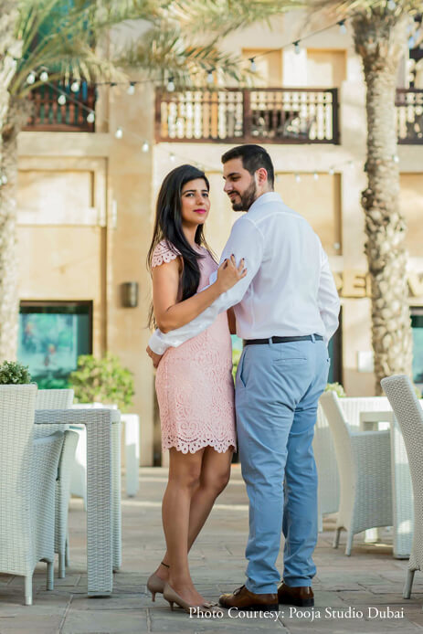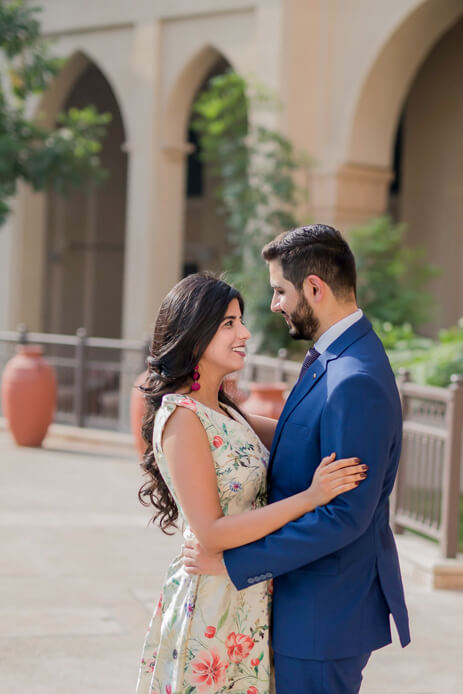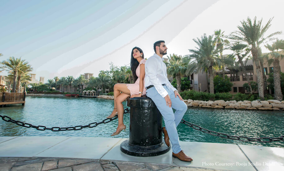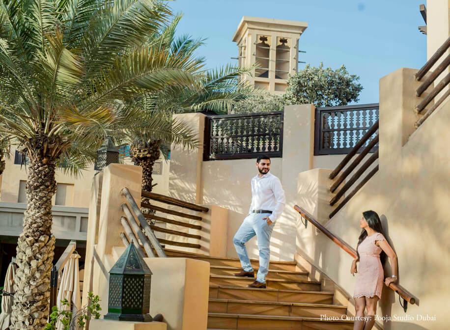 The series evolves from casual stances to gorgeously posed photos that embody elegance and poise. Vibrant colors and clean frames work as a dominant factor in making their pictures classic. Some of the most memorable photographs from this photoshoot are of the duo posing against the backdrop of the iconic Burj Khalifa. Their pictures exude a sophisticated charm and the tranquil surroundings of Madinat Jumeirah evoke a sense of serenity amidst which their love shines brightly. The smiles are contagious, the couple’s wardrobe resonates with the environs while their chemistry crackles making it the perfect pre-wedding shoot.