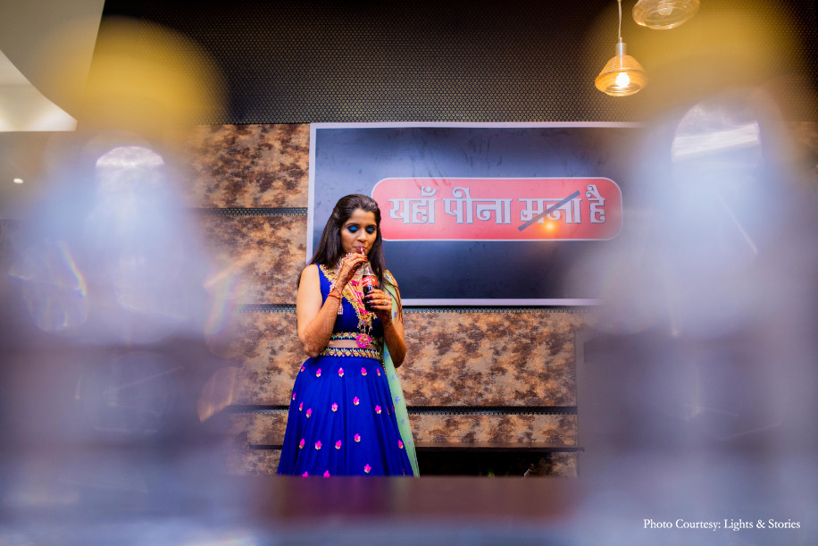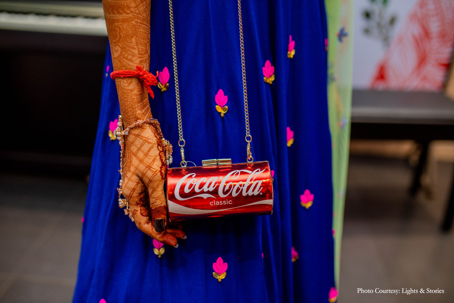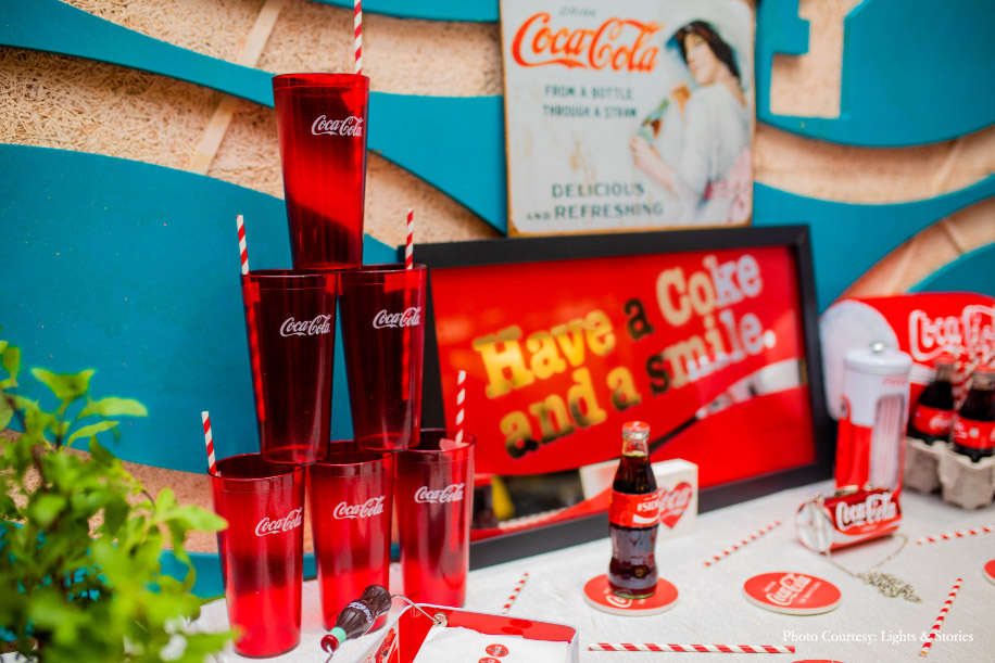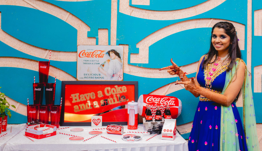 “Siddharth and I are non-drinkers and Coke fans. So we decided to have a ‘Coca Cola’ themed mehndi night. We designed a fun photo backdrop with props that were all things Coca-Cola. The best part of it was the tulsi saplings that we planted in Coca-Cola cans and distributed as giveaways. Sid even painted his shoes with custom Coke graphics.”