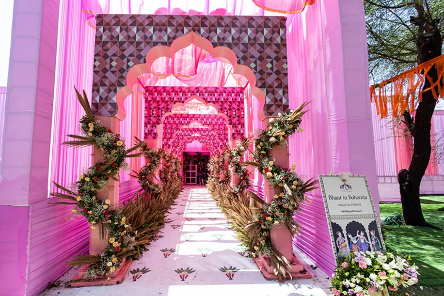 Giving us an overview of the mehndi and mayra, Ashish shares, “Mehendi was all about a pop of pink and purple hues. Beautiful arches were made at the entrance passage right outside the dome and the Mayra stage backdrop was the major attraction of the event with its minimalistic thematic hangings and props. From live block print dupatta, making lipsticks, handcrafted soaps, and perfumes to resin accessories, the giveaway carts were loved by all. The function began with welcoming mayredaars followed by mayra rituals of the groom’s side first. To beat the heat we also had an Ice gola station with over 30 flavours for guests to choose from.”