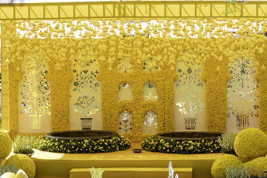 But it didn’t just stop there as the team raced against time to orchestrate the next event on the cards. Ashish shares, “Wedding Planning is all about overcoming challenges with grace and we were ready for yet another challenge ahead of us, which was to change the venue decor overnight for our next major function – Mehendi & Mayra in the dome the very next day! With over 1500 labourers working in 3 different venues, we managed to change the complete decor of the venue in 18 hours, despite the fact that our Sangeet venue was also available for the decor just one day in advance. We split our team into three parts and tackled the challenge in the dome, that is, transitioning from the modern decor setup to a completely traditional one.”