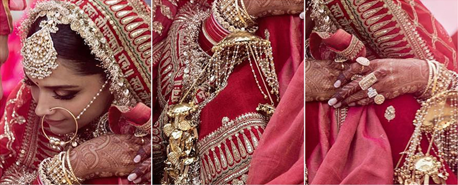 While her smile was the brightest jewel she wore, Bollywood’s diva, Deepika exuded such a queenly sheen throughout her wedding revelries. Including some exclusive ornaments, her bridal wardrobe unfolded classic sophistication and brilliant cuts.