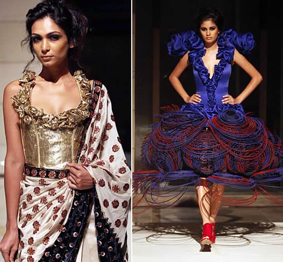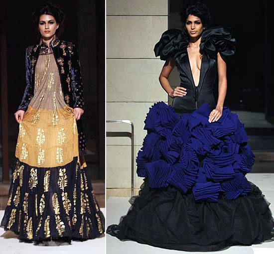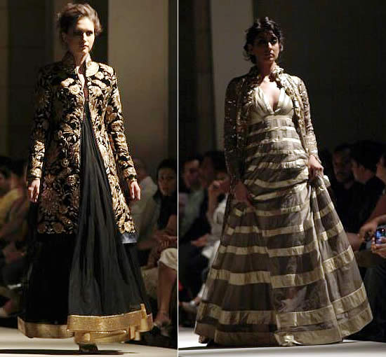 Rohit Bal’s collection at Delhi Couture Week titled ‘Khakasrtari’—Colours of Ash, is as symbolic as it gets; and what a comeback Bal made after grave illness with a collection that speaks of fashion thats timeless. Celebrating the 2 decades of his impeccable craftsmenship. we got a glimpse of Bal’s characteristic style – intricate zardozi work on velvet jackets paired with voluminous skirts, lots of Taj motifs, delicate mukesh work, layers of chiffon and more. Plenty of eye-candy for Brides-to-be.