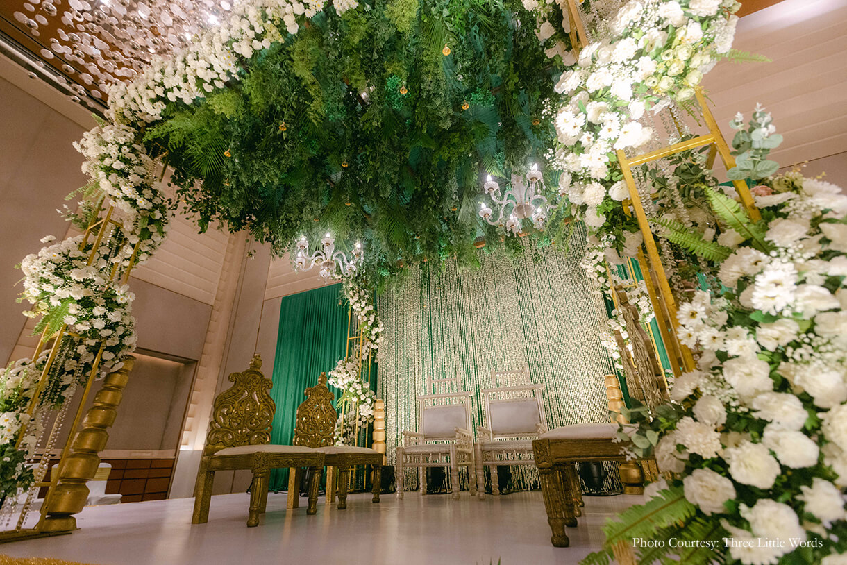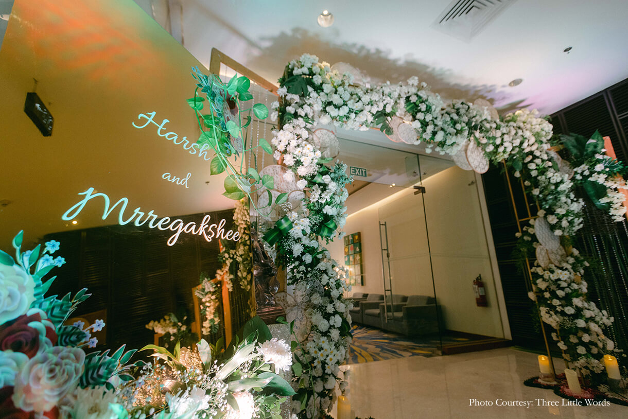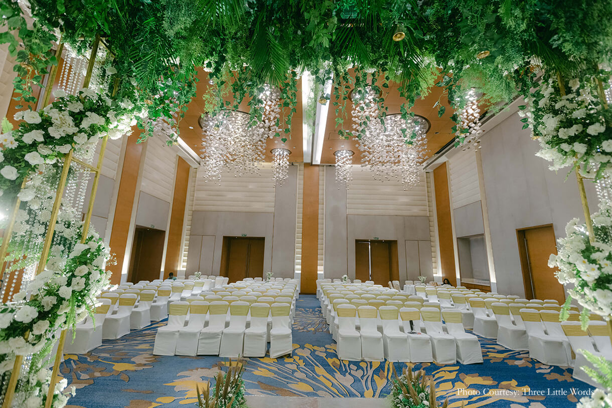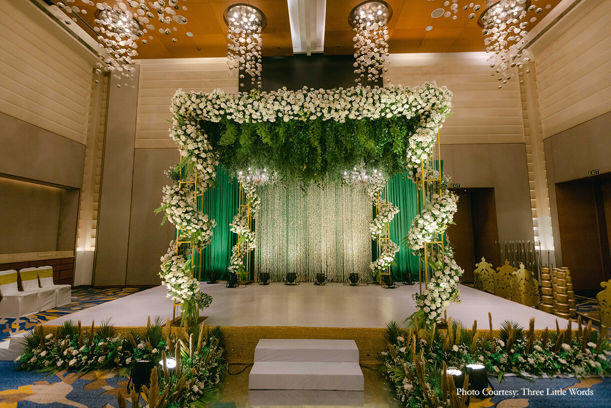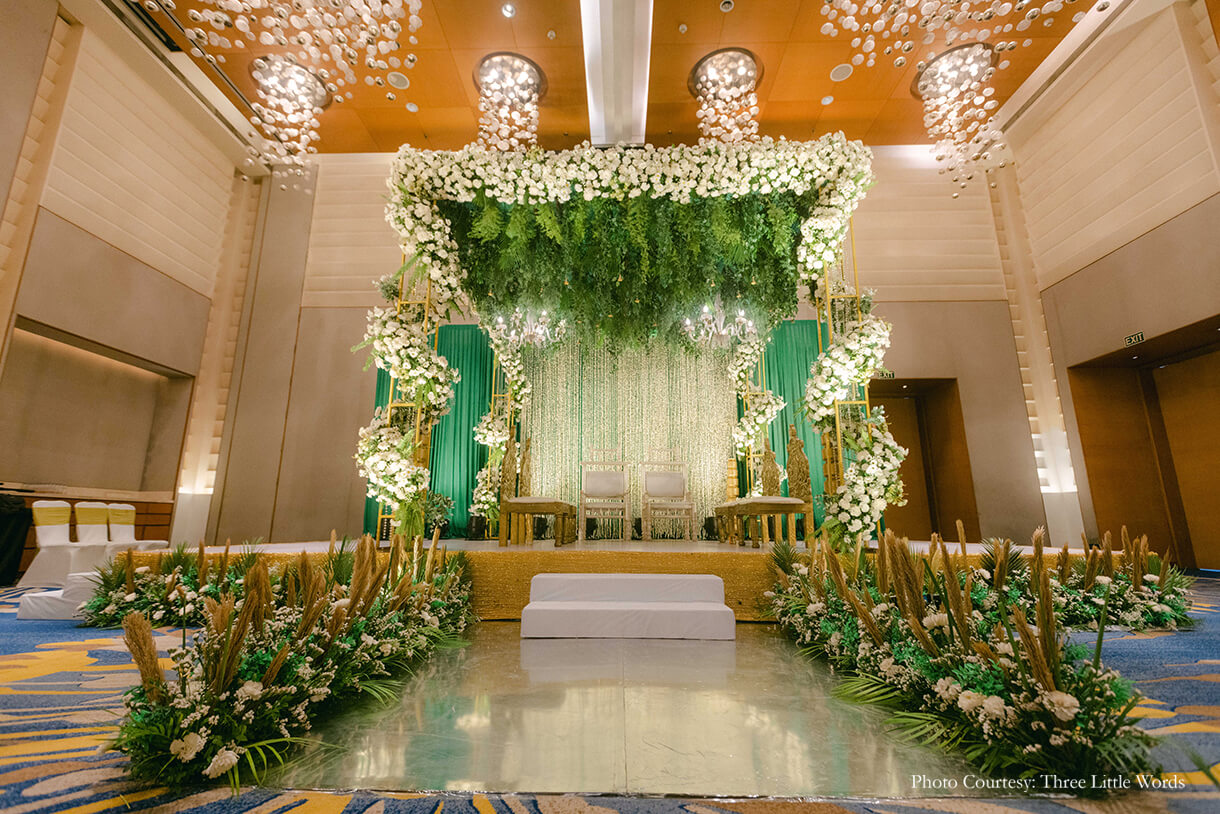 A celebration that transported one to a serene garden-like atmosphere while being completely indoors, Mrregakshee and Harsh’s wedding was a true reflection of their love for modern aesthetics and nature. Designed by WeddingSutra Favorite – Just Engaged Weddings and Events the union was a pleasing combination of green and white hues created using ample floral elements and ivory elements.