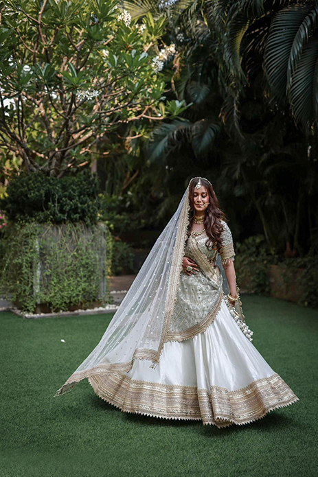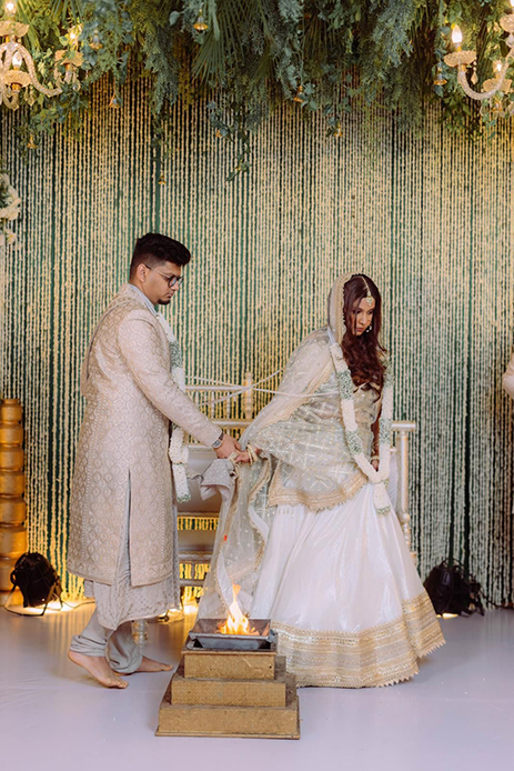 With a twofold role that consisted of designing as well as planning the union, team Just Engaged Weddings and Events had their hands full. Giving us an overview of the union the team shares, “The white and green wedding of Harsh and Mrregakshee was a magnificent celebration, blending tradition and modernity with grace and elegance. The chosen colour scheme created a serene and enchanting atmosphere, symbolizing purity, harmony, and new beginnings. The venue was adorned with exquisite floral arrangements featuring white roses, hydrangeas, and other white blooms, accentuated by lush green foliage, creating a captivating ambience.