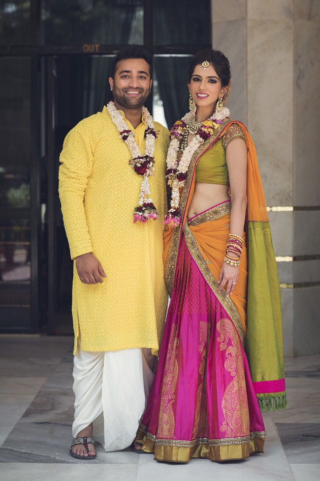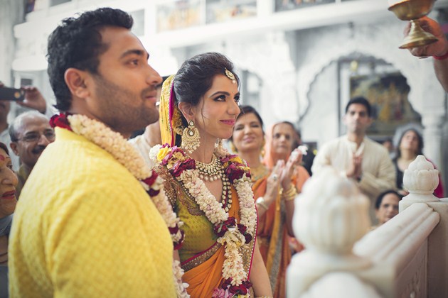 Nishka wore a bright pink lehenga teamed with yellow dupatta and green choli. Kundan jewellery and a golden clutch completed her bridal look. Dhruv kept it simple in a yellow kurta. After the traditional festivities the guests proceeded for a traditional vegetarian feast prepared by the temple kitchen.
