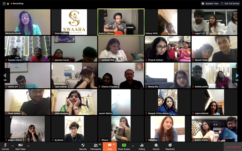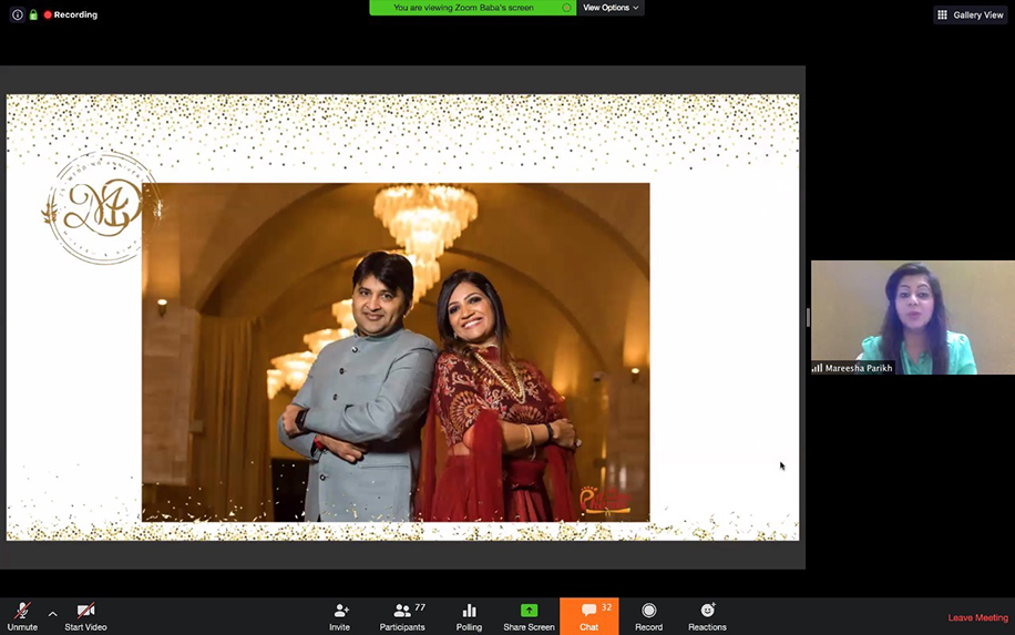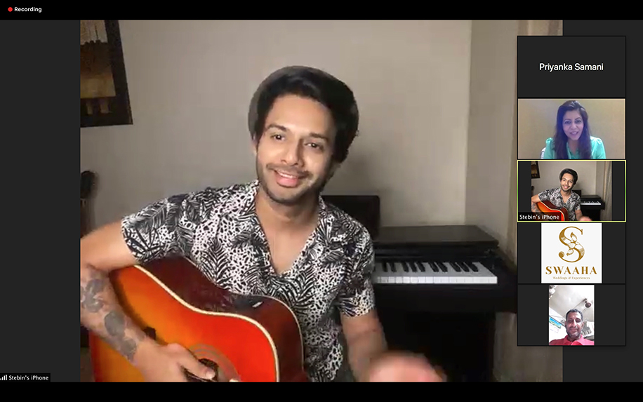 With a focused vision in mind, team Swaaha chose the concept of #ZoomPeDhoom for this fun virtual party which urged all family members to use the popular video calling app ‘Zoom’ to join the happy couple who were celebrating from their home. Equipped with a guest list of approximately 160-180 people, this was no easy feat, and the team went out on a limb by creating exciting e-invites and virtual backgrounds to keep things interesting. Kick-started by Mareesha Parikh – Creative Director – Swaaha EMC & CEO The Wedding School the evening was off to a great start as she hosted the party and made everyone feel comfortable with her witty anecdotes and electrifying energy. Following this were heart-rendering acoustic tunes by acclaimed artist Stebin Ben who accepted song requests from various family members as he belted out melodious tunes that had everyone enthralled.