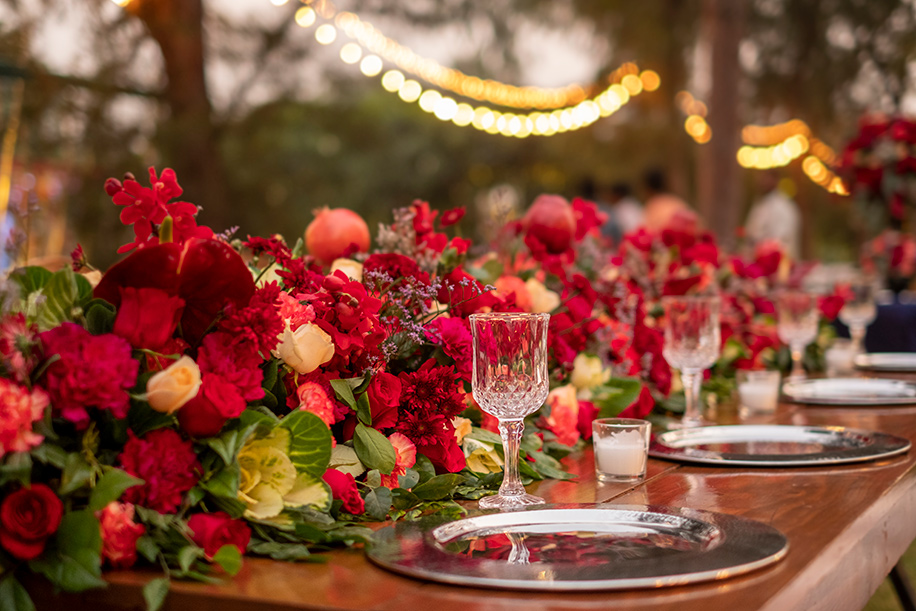 The classic dinner setting was the highlight of the evening with red blooms running across the center of the table. Accompanying the table layout were authentic silver show plates, glassware and candle stands that created a mesmerizing effect. A canopy of greens and soft lights around the table arrangements lent a classic vintage charm to the setting.