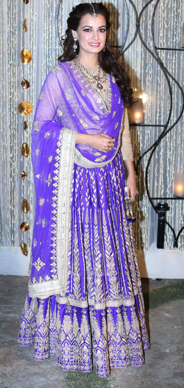 For her Sangeet ceremony at a farm house in Chattarpur, New Delhi Dia Mirza wore an Anita Dongre lehenga and polki jewellery. Sahil Sangha looked sharp in a black bandhgala and white churidaar.