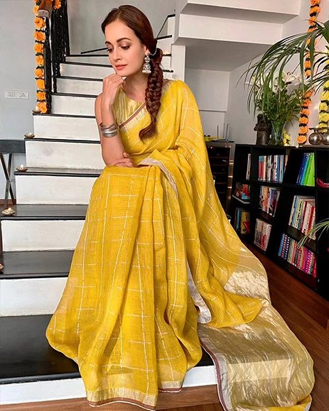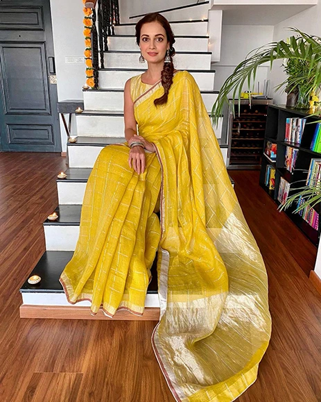 Simple, Sustainable, Festive. Dia Mirza, who is known for actively lending her voice to sustainability, goes festive in a gorgeous citrine linen Zari saree with contrast selvedge and Zari details from Anavila. She paired this with a sleeveless blouse that matched the selvedge on the saree and accessoried with silver jhumkis and bangles.