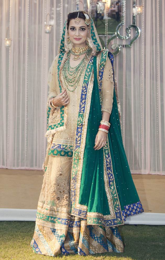 Dia wore a beige and green Ritu Kumar sharara for the wedding and a Shantanu & Nikhil gown for the reception. Sahil wore a cream silk achkan and emerald green kurta by Raghuvendra Rathore. Dia’s wedding sharara was inspired by Ritu Kumar’s Falaknuma collection, which highlights the heritage of craftsmanship that the city of royal Hyderabad is renowned for. Dia, who is from Hyderabad briefed Ritu Kumar about wanting a Hyderabadi touch for her Delhi wedding and keeping this in mind Ritu Kumar designed the rich, traditional ensemble (incidentally after Dia Mirza announced her engagement, we were quite sure the Hyderabad girl would get married at Taj Falaknuma Palace).