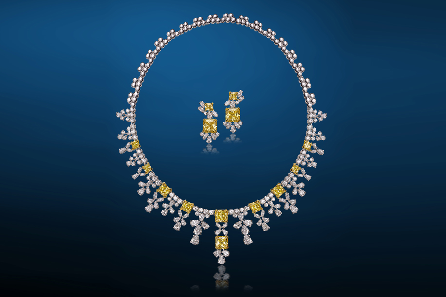This gorgeous necklace beautifully balances semiprecious yellow diamonds with brilliant cut American diamonds in 22kt silver. It is easy to imagine the mother of the groom welcoming the newest member of the family with arms wide open, wearing these baubles that radiate beauty and class.