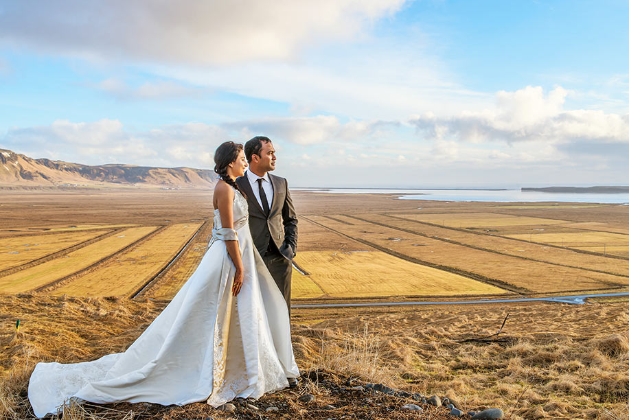 Iceland is called the land of fire and ice for a reason. It would be unfair to have a theme considering the breathtaking landscapes all around. However, we wanted to stick to western wear for the shoot. Yogi insisted on wearing his charcoal grey suit as most of the Icelandic soil is gray or black due to the volcanic activity. I wanted to wear a wedding gown, as I was not able to accommodate that into the Indian wedding. So I hired a stylist with the help of our photographer.