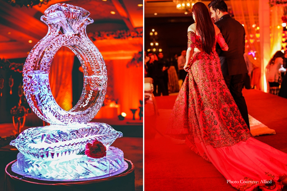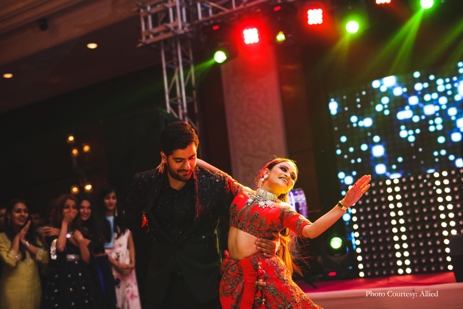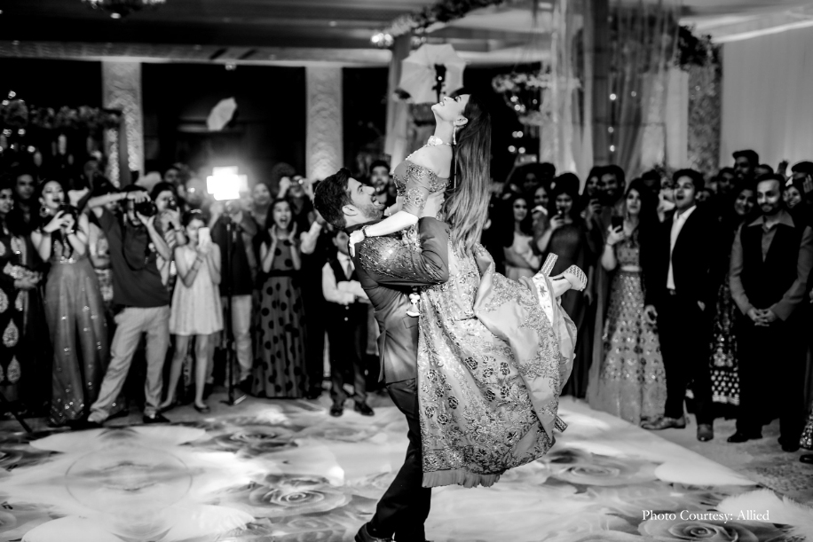 The engagement was hosted in the Taj Palace‘s magnificent ballroom which was resplendent with classy floral decor, lights and natural vistas of the hotel like magnificent staircases that proved to be fantastic backdrops for photos. Feast your eyes on sweet engagement that charms with moments captured by the Allied team where the much-in-love couple twirl, kiss, and dance together giving us major couple goals.