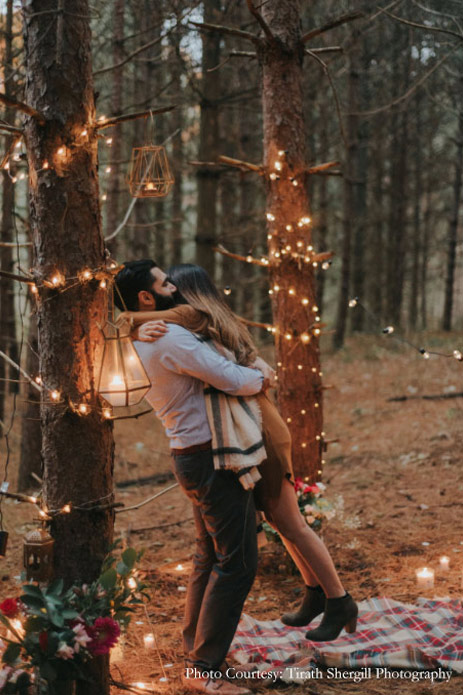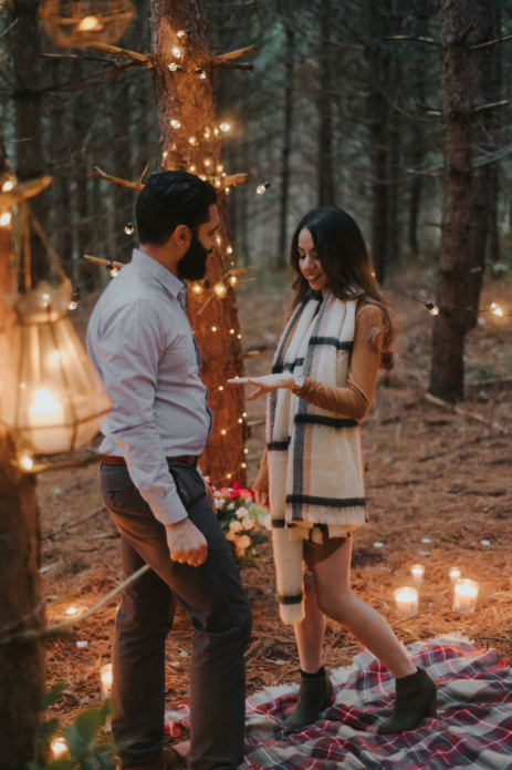 It’s our favorite time of the year! As the holidays roll around, so do grand gestures, miniature boxes concealing dazzling rocks, and ultimate professions of love. There’s something about the winter holidays that inspires couples to cosy up and make it official and Ushdeep was no different when he decided to surprise Babita with a dreamy proposal in the middle of a forest!