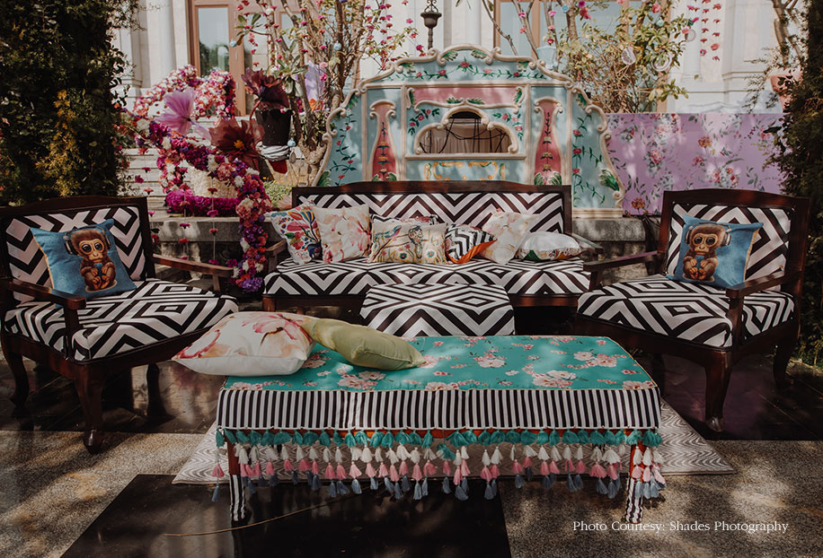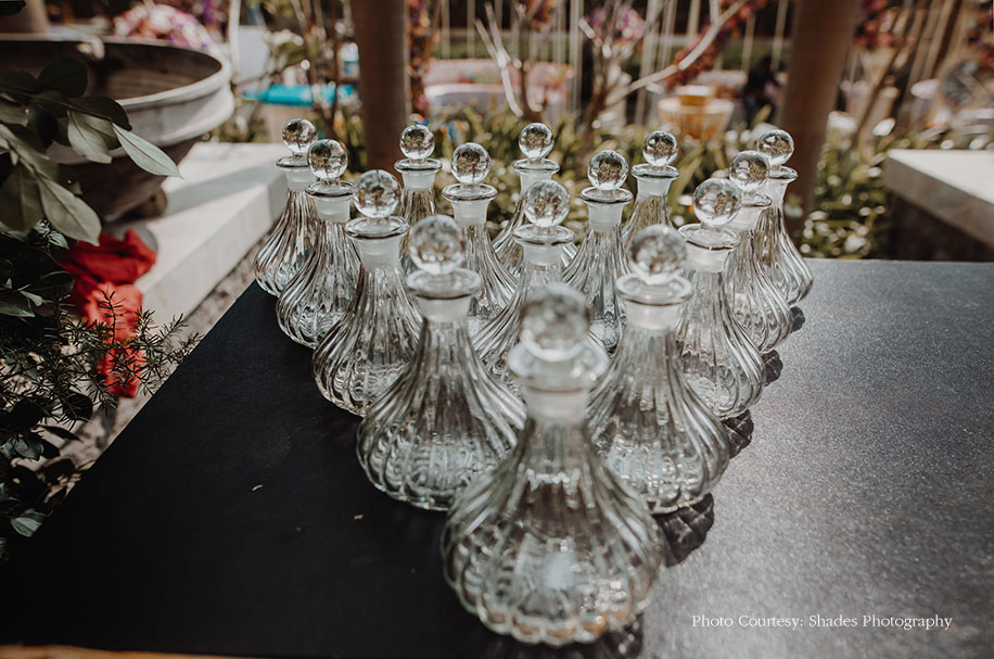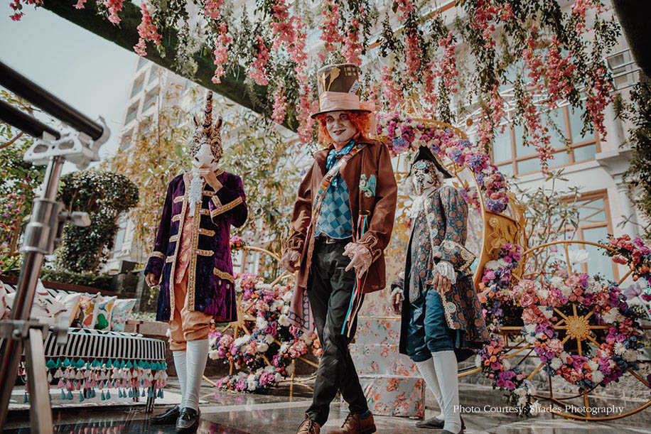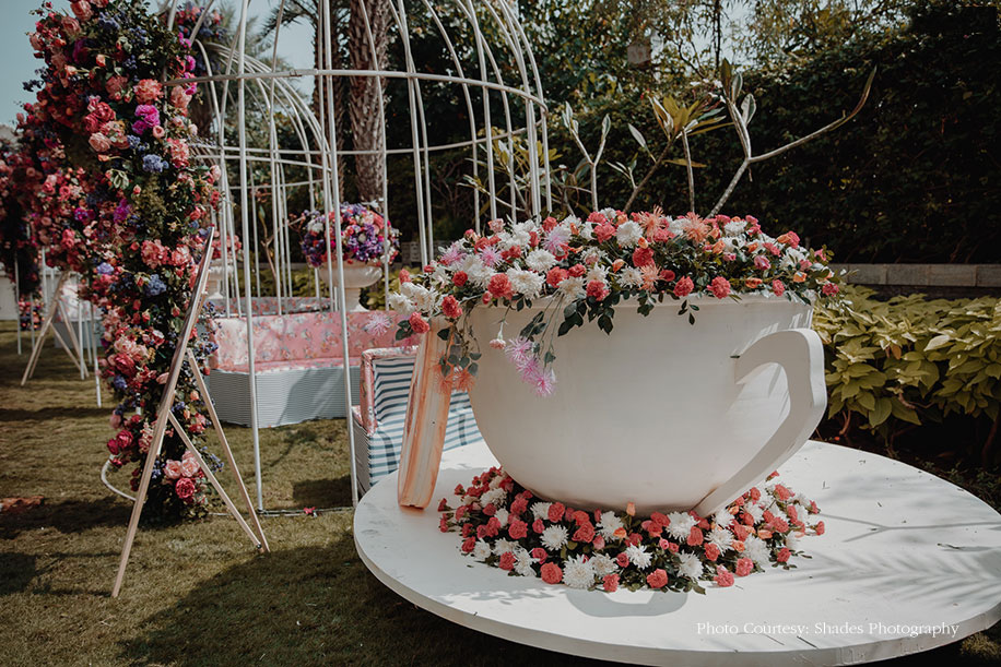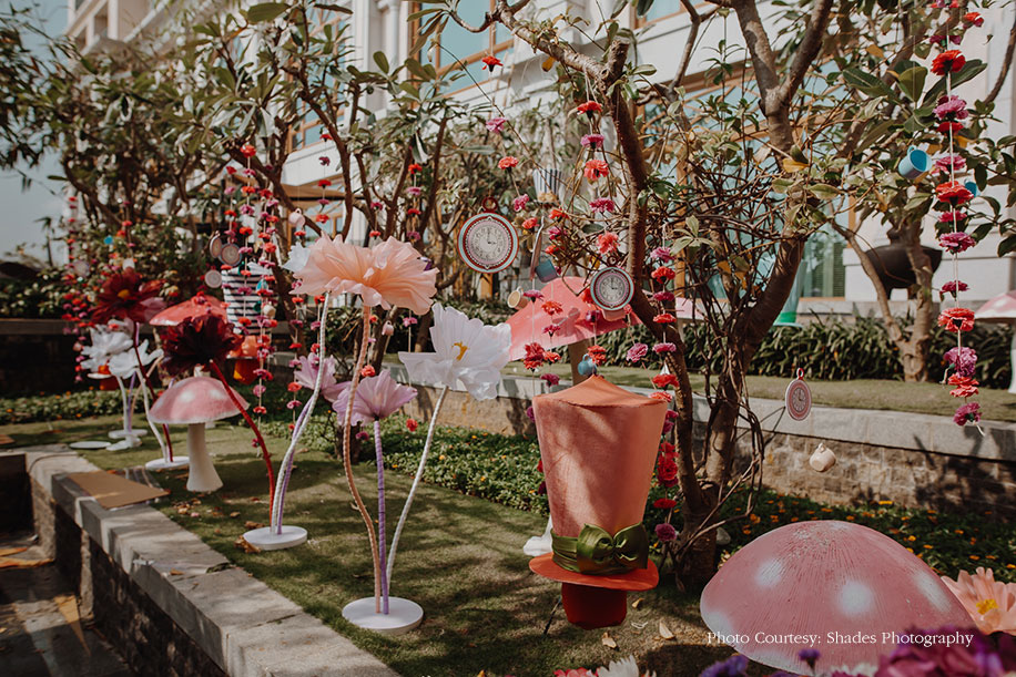 Priti shares, “The bride envisioned the mehndi function to capture the magic of fairy-tales, which she loves so much, for a fun event which would be entertaining and create a lasting memory. The theme was incorporated into every aspect of the function, starting with the four flavors of teas signifying the Mad Hatter’s Tea Party that were included in the gift hampers sent to guests’ rooms. Along with a poetic invitation, the hamper also included an infuser and a note attached to a large key like the one Alice uses to enter into Wonderland. The guests had to write their wishes for the couple on the note and hang it up at the entrance of the venue.”