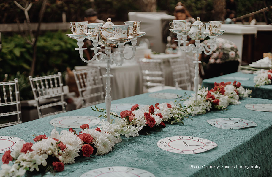 “The bride had always wanted to feel like a princess for her wedding, so we created her very own golden floral carriage with footmen and giant flowers.” The main function was hosted at the ‘Chess Garden’ of the hotel, with the chessboard being the dance floor under a canopy of pink and white hanging flowers. Quirky signage to ‘Wonderland’ set the mood for the afternoon. A giant floral teacup and saucer installation, a photo-booth made from an antique telephone booth filled with flowers, a towering floral bar and lounges in the form of floral cages made for an arresting sight. Clocks, hats, and teacups and saucers were hung from the foliage. Table mats printed with clocks were placed amidst bright floral runners.”