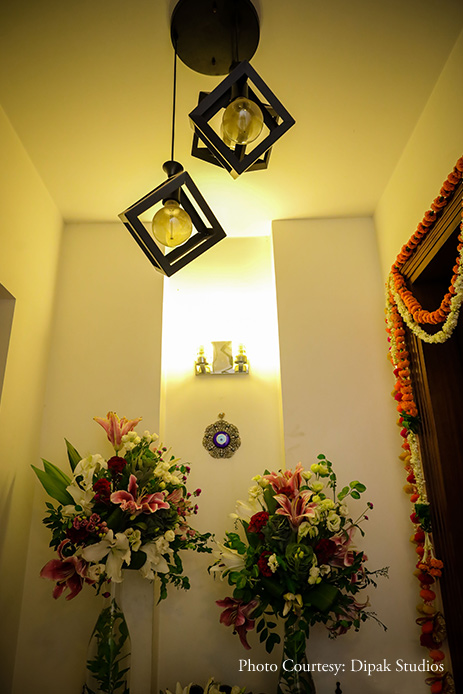 Reflecting on the process behind choosing a home-based wedding and all the planning that went behind the scenes, Riti shares, “We stuck to our original wedding date and didn’t postpone it despite the uncertain situation in mind. Since we’d planned a grand wedding on the cards from the start, it was initially a bit difficult to scale it down to a home wedding where we could only invite our close family members with around 30 people. Everything was done at home, right from the decoration to both our outfits. To embellish the interiors, we called in a neighborhood flower vendor who beautifully decorated the house. The food served was, of course, homemade and all the other family members attended the ceremony via a Zoom call. They had also, graciously, created heartwarming dances and video snippets that my brother compiled and played as a surprise for both of us.