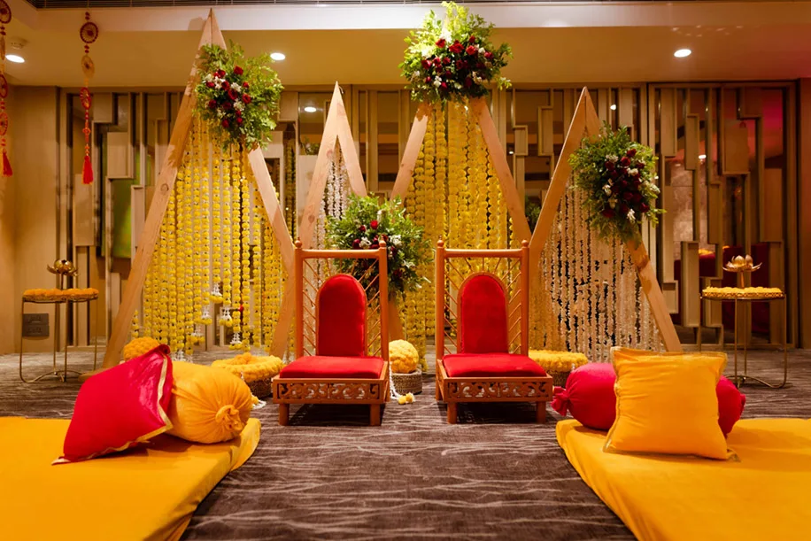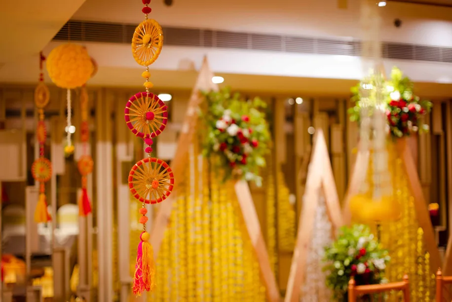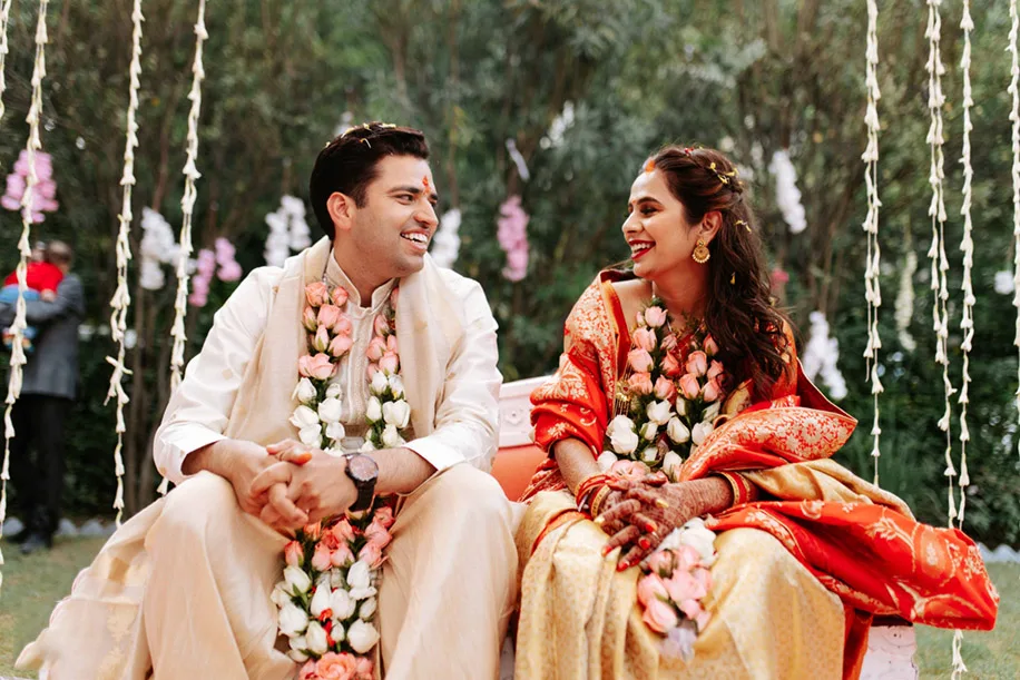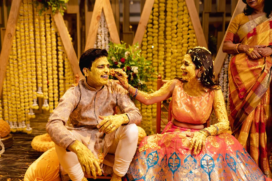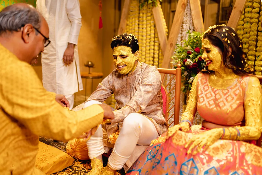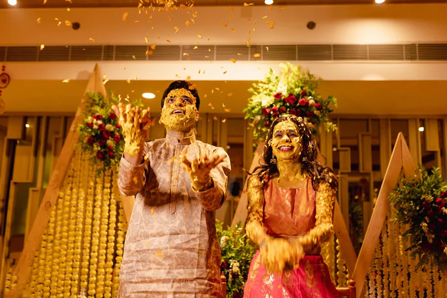 The first event on the cards was a bright and playful Haldi ceremony where the decor included thick marigold garlands that embodied the spirit of the ceremony. After the ceremony, the couple was showered with flower petals as they playfully slathered each other with turmeric.