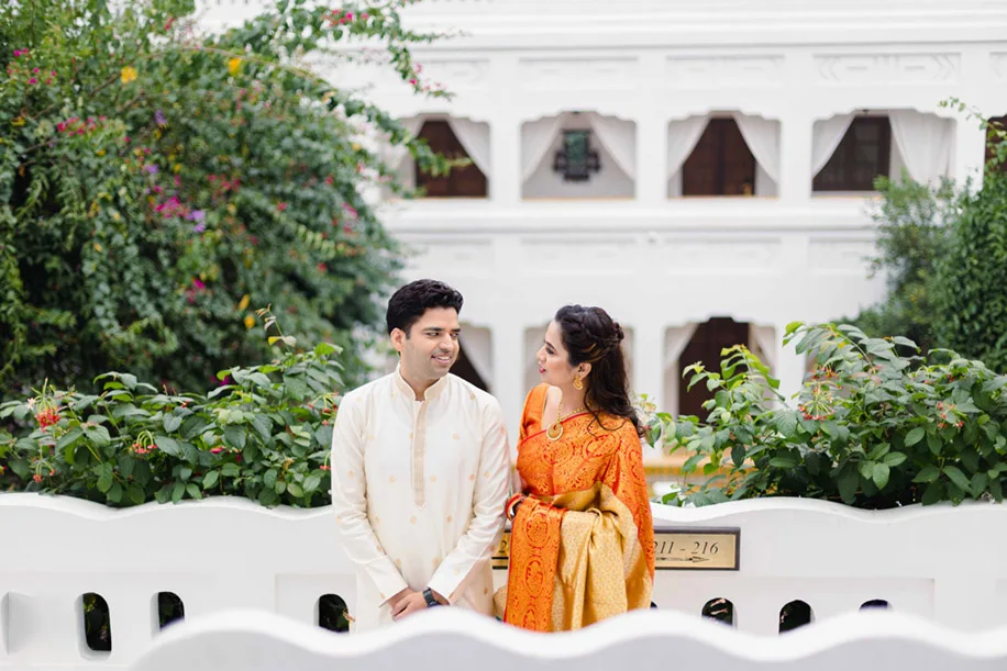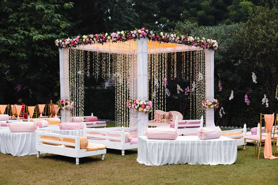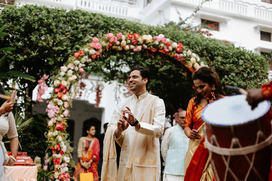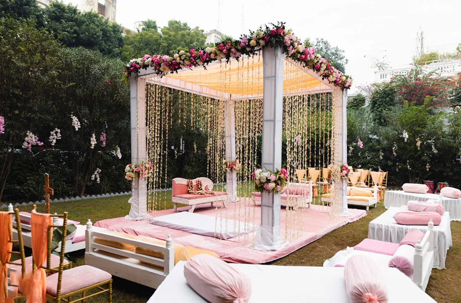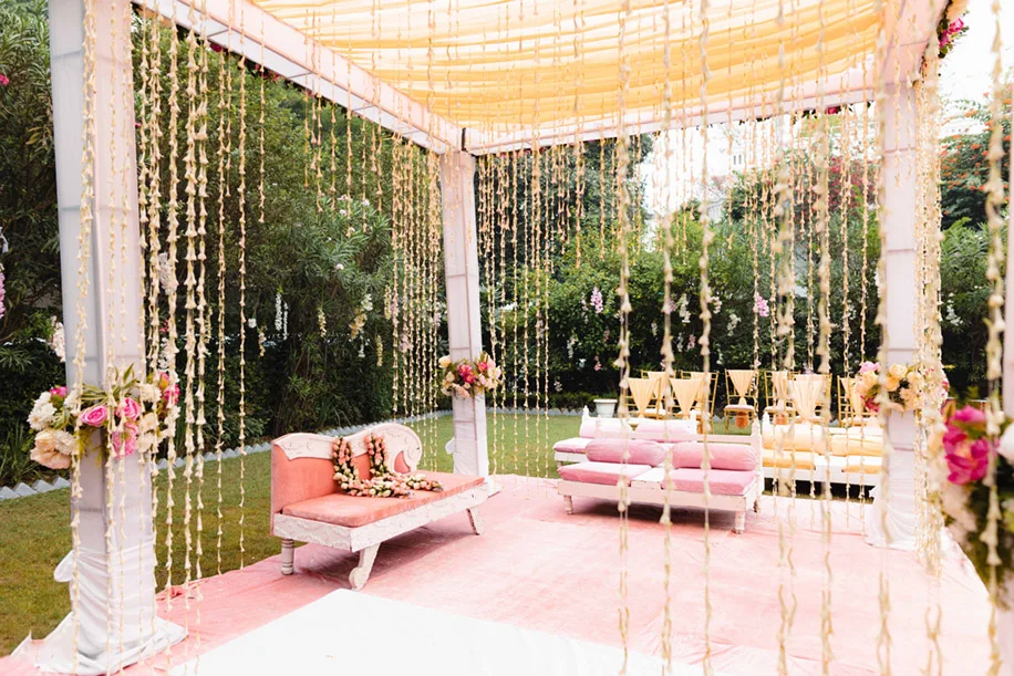 Giving us an in-depth overview of the wedding and how the couple expressed their progressive views by crafting their own rituals, Neha Mehrotra, the founder of Foreign Wedding Planners shares, “Himani and Sumit are a modern-minded couple who wished to skip the age-old patriarchal traditions that one sees at Indian weddings even today. As independent individuals who were paying completely for their wedding, they made their own decision which resulted in them crafting their own rituals. Himani being a forward thinker took the unconventional route by not covering her head with a dupatta during the Phere nor did she wear an elaborate lehenga! Instead, she showcased her love for simplicity by wearing a beautiful silk saree. The Kanyadaan, which remains a popular concept in many Indian weddings to date was skipped entirely. Finding the right pandit for them in Lucknow was definitely a challenge since it’s a city where traditions are steadfastly followed. Our original plan was to include a female priestess in our rituals. However, we couldn’t find one and had to settle for a male pandit who also conducted the wedding in a gracious manner. Finally, the couple made their promises with a customized Phere ceremony that emphasized equality.” An apt reflection of their love for fuss-free things, the Wedding decor too was minimalistic with fresh blooms and light pink hues. Hosted under the bright blue sky and dappled in golden sunlight the wedding ceremony was breezy and romantic.