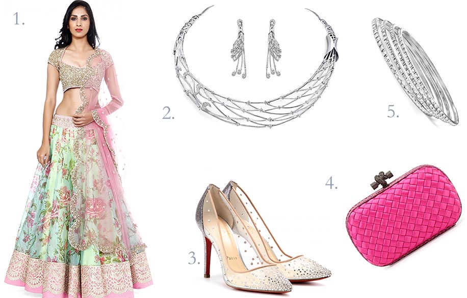 Seen here: 1. Anushree Reddy floral lehenga choli in mint green and pink 2. Platinum Evara necklace set 3. Christian Louboutin Silver and crystal pumps 4. Bottega Veneta clutch 5. Elegant Evara Platinum Bangles.
