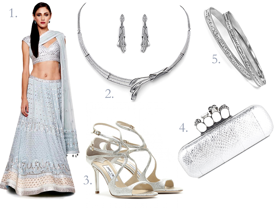 Seen here: 1. Anita Dongre lehenga choli in powder Blue 2. Platinum Evara necklace set 3. Jimmy Choo strappy sandals 4. Alexander McQueen clutch 5. Elegant Evara Platinum Bangles.