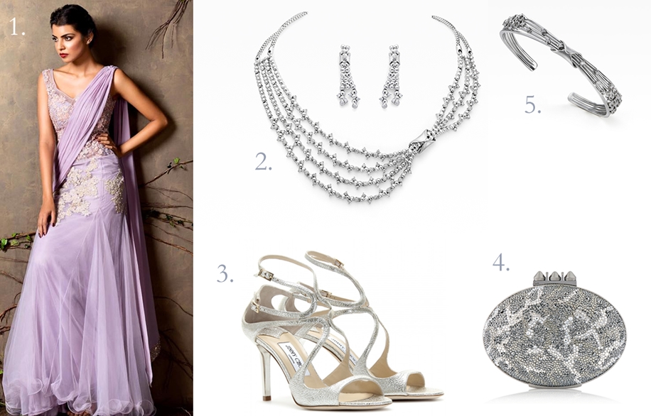 Seen here: 1. Shyamal and Bhumika lehenga inspired gown in lavender 2. Platinum Evara necklace set 3. Jimmy Choo Silver Strappy Stilettos 4.CHRISTIAN LOUBOUTIN Mina crystal-embellished suede clutch 5. Elegant Evara Platinum Bangles.
