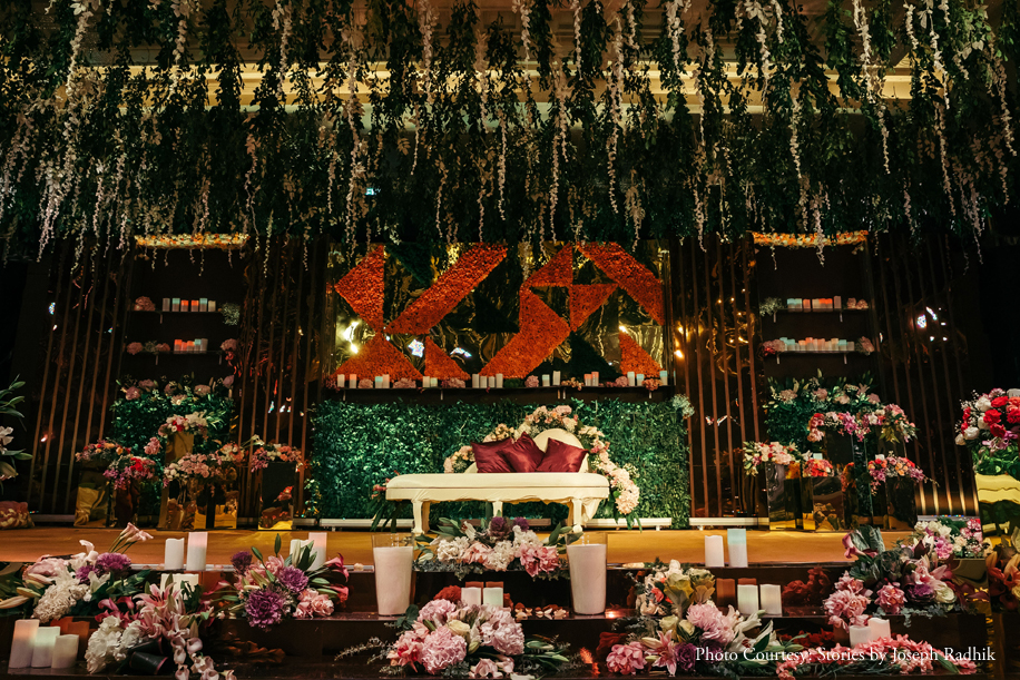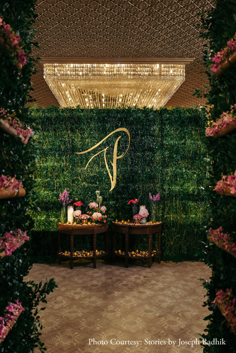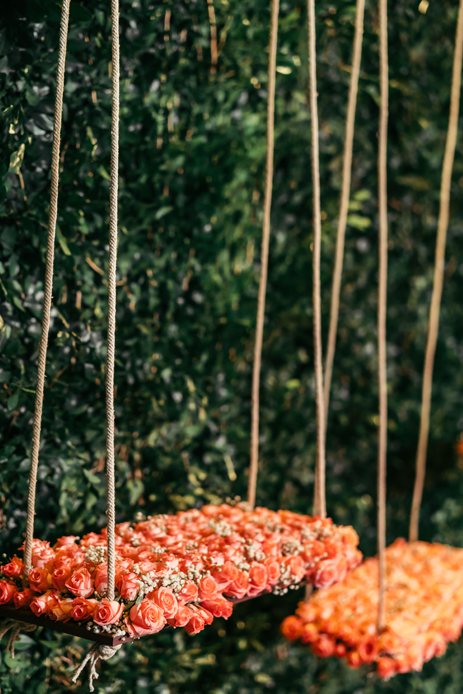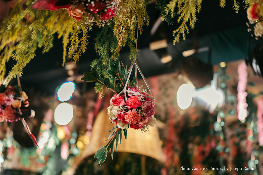 A central installation made with alco panels, crystal ‘shamadans’ (candle holders), and calla lilies exuded opulence, while ‘Swings of Joy’ made from pink roses brought in the fun factor.