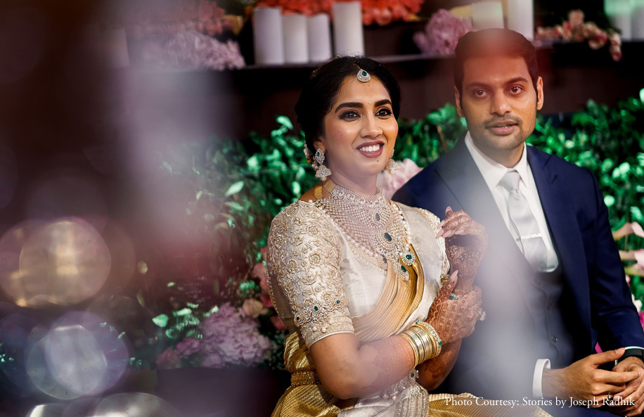 The event was divided into two separate ceremonies and included a traditional engagement function and a reception where the bride made an impression with her tasteful ensembles. At the tradional ceremony, she was resplendent in a golden Kanchipuram saree from Prakash Silks which was embellished by Abu Jani Sandeep Khosla.