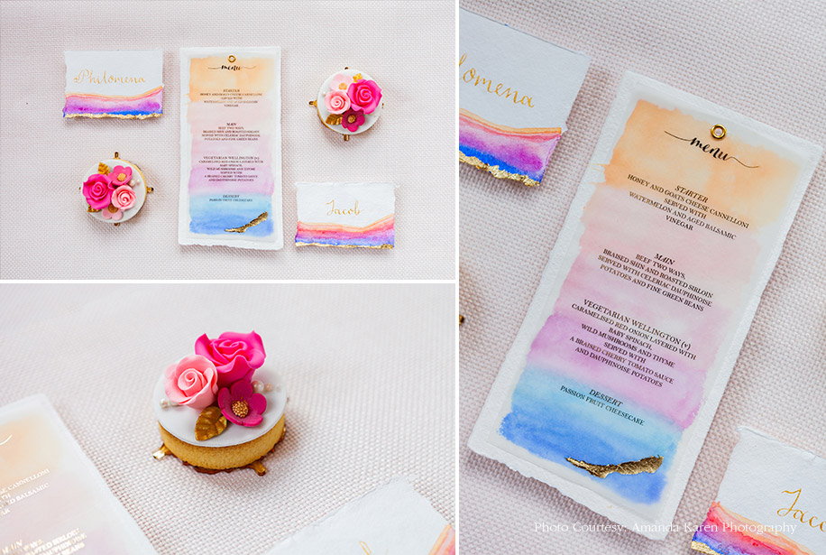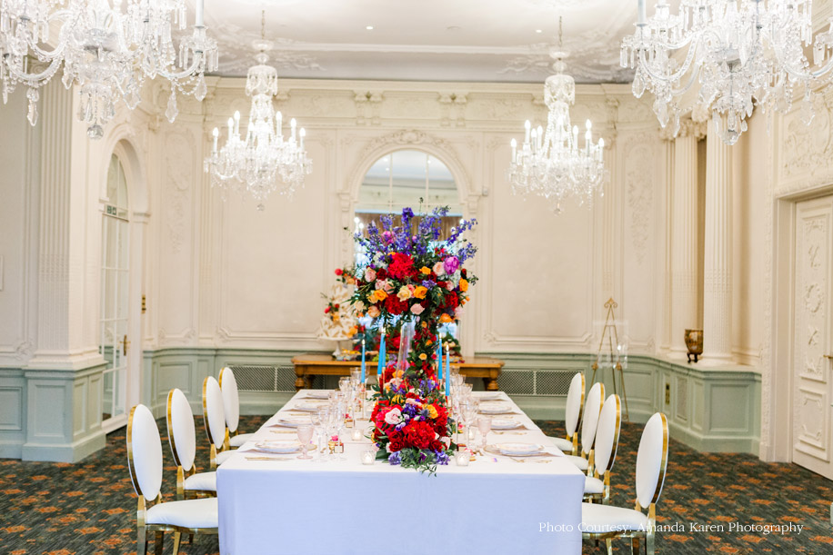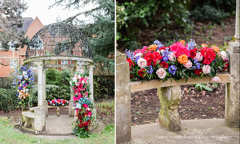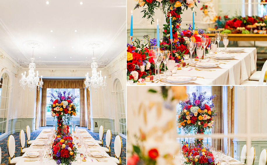 Radhika Nathwani, founder of the UK-based wedding planning collective Radhika & You, conceptualized and created a vibrant wedding decor shoot to inspire newly engaged couples. The bold yet feminine and romantic tones of the set up, and interesting textures used in styling, floral decoration, confectionary, and the cake are striking and memorable.