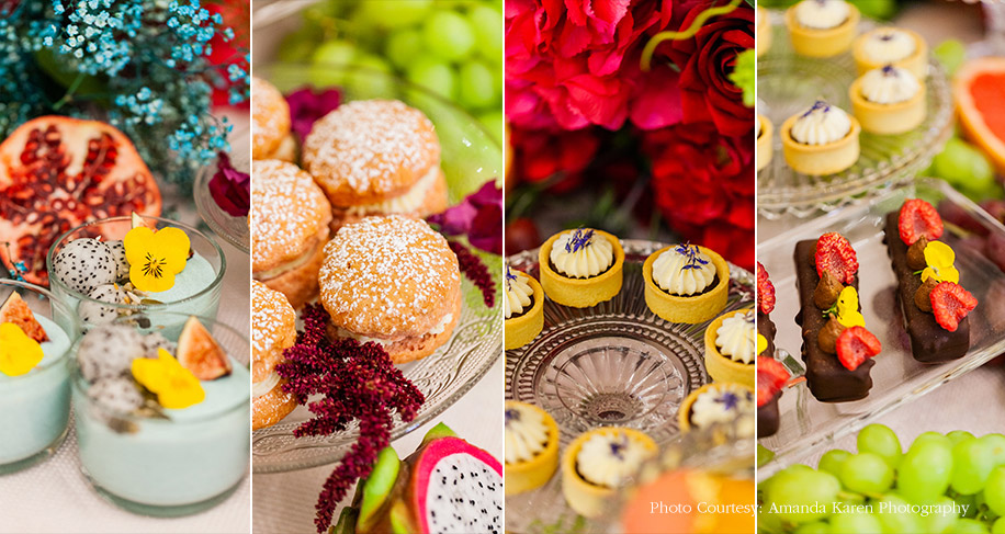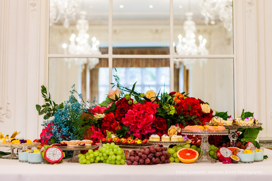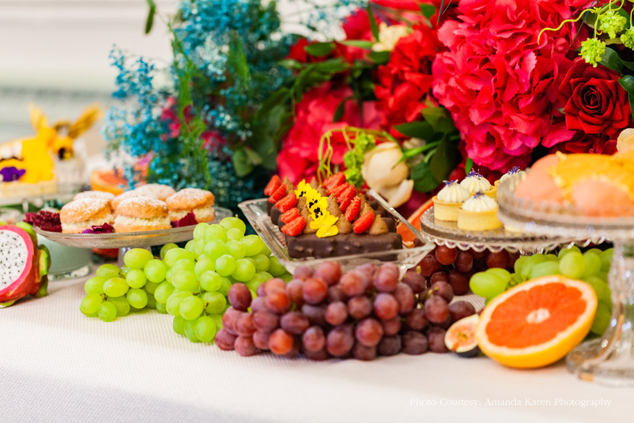 An explosion of exotic fruits add an alluring Mediterranean vibe to the setup, while myriad gourmet confectionary and other desserts is reminiscent of Parisian poise. Bathed in an abundance of natural light, the indoor settings include Victorian chandeliers that add to the grandeur of the scene, while bright colors of the decor are perfectly offset by sophisticated white and golden furniture, linens and tableware.