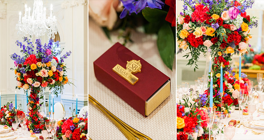 The elegant decor is contemporary and elegant, and has a gentle vintage nuance. Ideal for formal events such as a cocktail or a reception dinner, the versatile combination of elements make it perfect for even a brunch affair or a high-tea. And while the exotic flowers and foliage speak of a blooming summer season, the richness of the hues and timeless feel of the base notes of white and gold can make it a gorgeous choice for even a fall or winter affair.