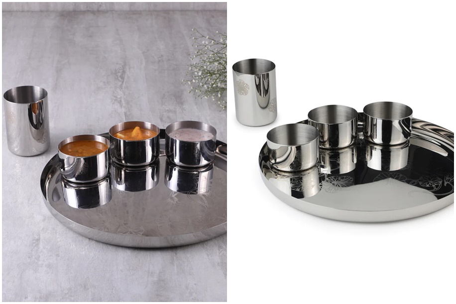 7. Etched with beautiful motifs inspired by the Garden of Eden, the Eden Thali Set in stainless steel is as timeless and elegant as it is durable.