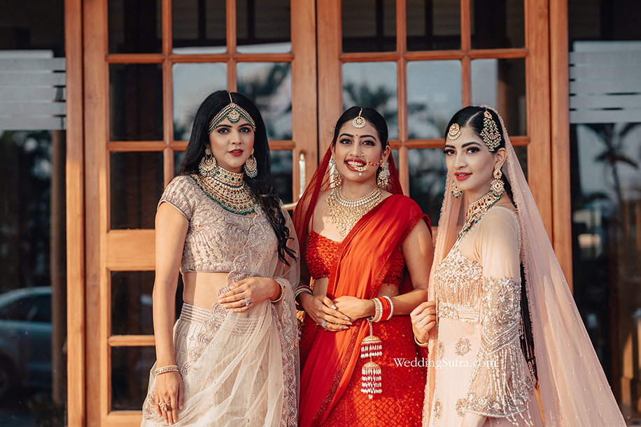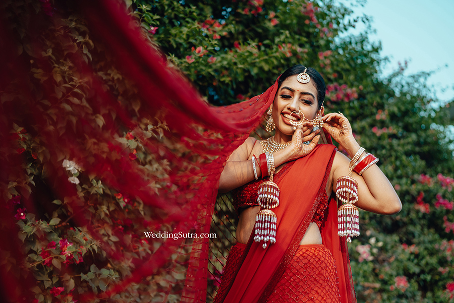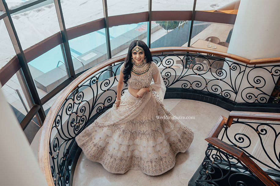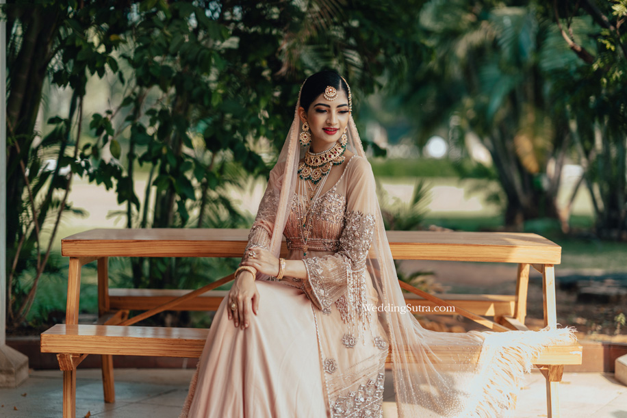 “Tangibles like body type, shape, and skin tone play a large role in finding the perfect outfit for every bride. For example, dressing a bride with a wheatish skin tone in beige is going to wash her out, while a vibrant color will make her look radiant. These need to be considered even while accessorizing. Going all out with a heavy matha-patti or OTT layering may be something you dreamed of, but they can easily overwhelm a petite frame.”