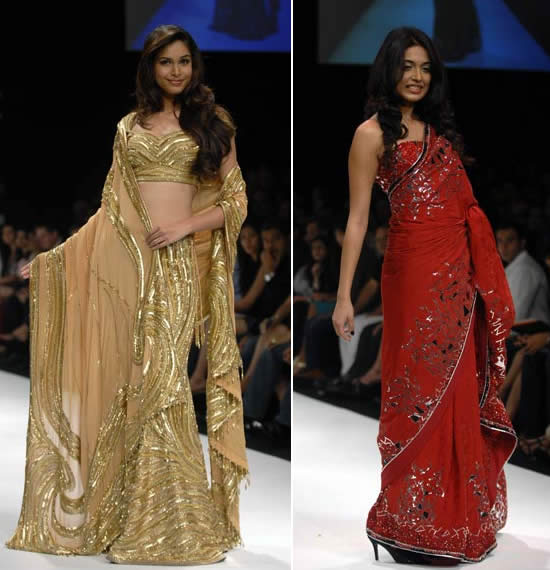 The showstopper bridal outfits were seen on Amruta Patki, Miss India Earth 2006, wearing a full gold and crystal lehenga, choli and lush dupatta and Sara Jane Dias, Miss India World 2007, in a fiery red crepe sari sparkling with stunning embroidery and bustier.