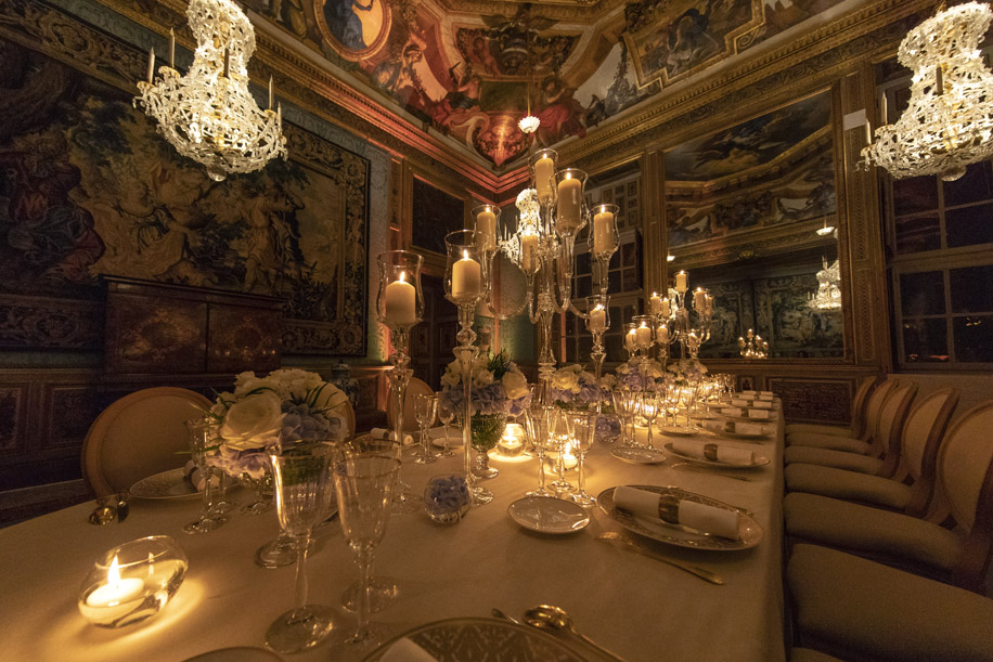 The moment was followed by a private tour and dinner at Chateau Vaux-le-Vicomte. Here the guests enjoyed special entry in a fleet of private helicopters, a mesmerizing musical act by performers, an enchanting fireworks show, a 6-course fine dining experience and lastly, they were spellbound within the castle, lit up with 2000 candles.