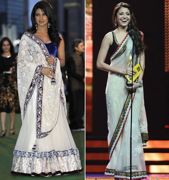 Priyanka Chopra in a Manish Malhotra Lehenga; Anushka Sharma in a Sabyasachi Saree