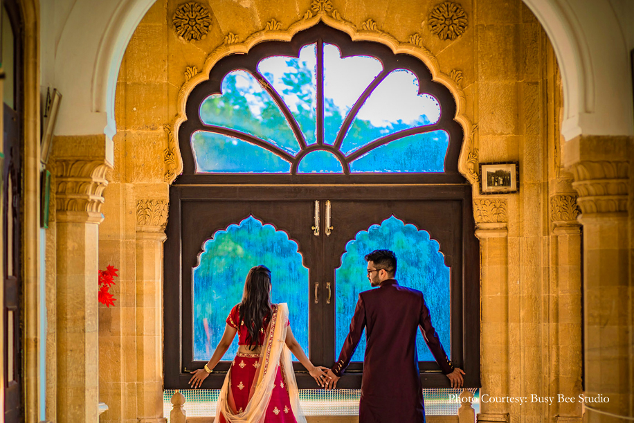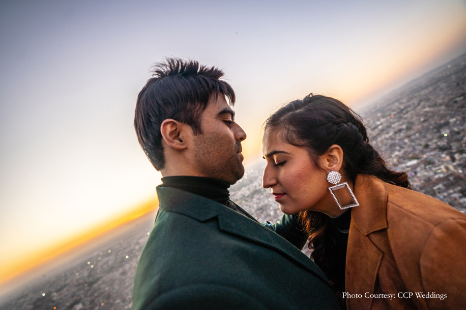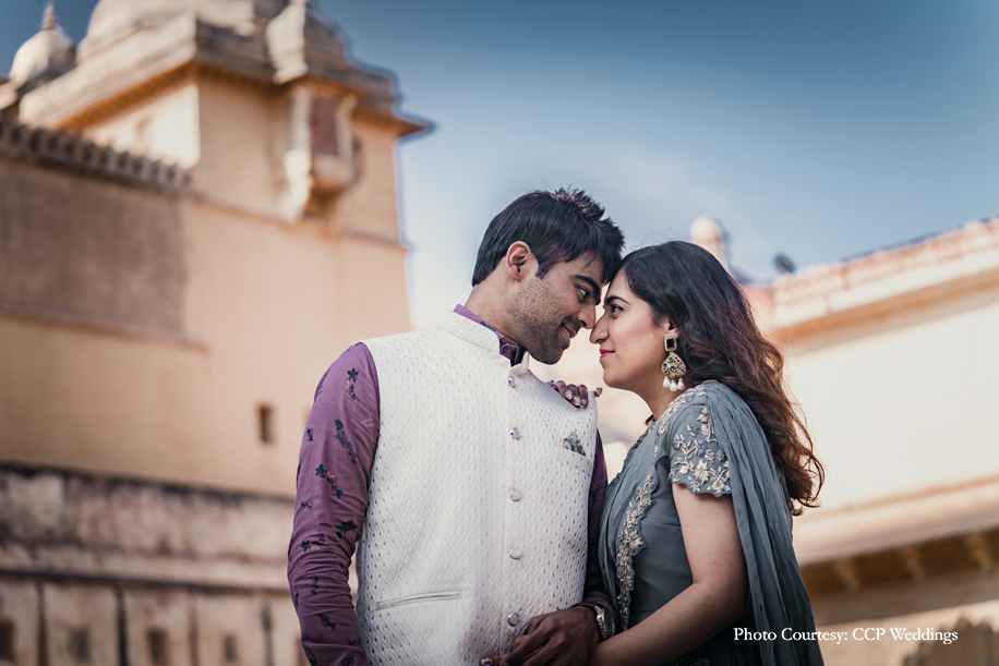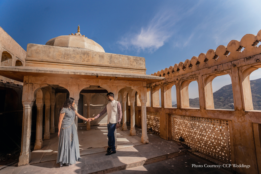 The symmetry of the colossal forts of Jaipur paired with the candidness of Deepika and Dileep make for exceptional photos from this pre-wedding photoshoot. A glimpse of red creates a stunning contrast with the natural backdrop. CCP Weddings makes use of interesting elements like shadows formed by mesh panels of the fort and the azure skies to add a touch of vibrancy to this photoshoot.