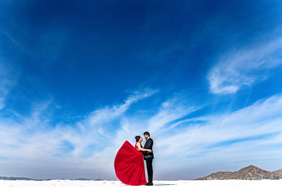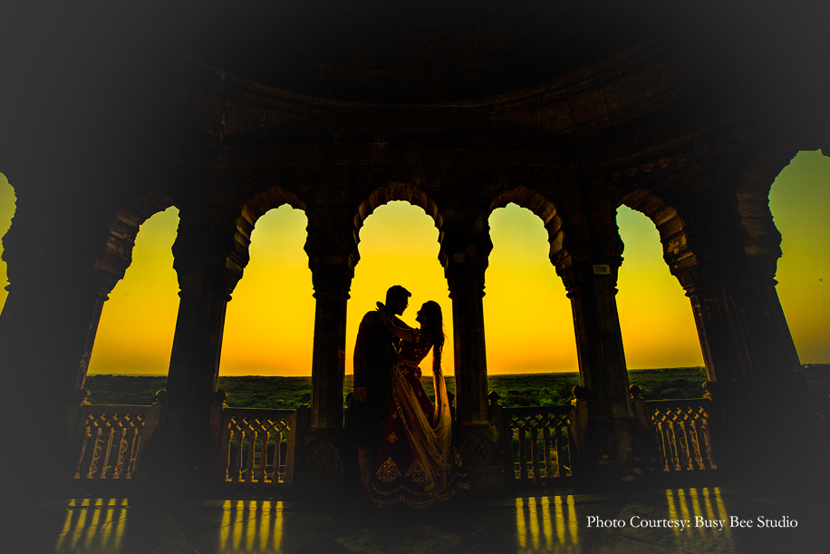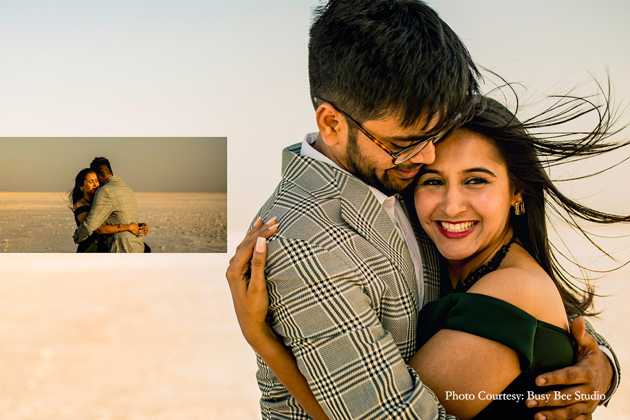 A timeless love captured stunningly by Busy Bee Studio in the midst of cultural heritage dominates the vibe of Shradha and Kavan’s pre-wedding photoshoot. As the golden environs create a sense of drama, the white sand expanse of the Rann of Kutch brings in a calming paradoxical twist.