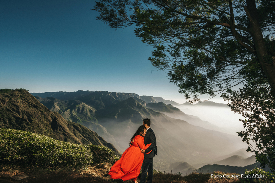 Isha and Sumit added a cinematic twist to their romantic pre-wedding photoshoot set in scenic Kerala. Plush Affairs manages to incorporate the characteristic traits that Kerala is known for – the lush landscapes, mountains and earthy indoor venues. The chemistry between the couple is tangible in the Bollywood-esque frames and their charming poses.