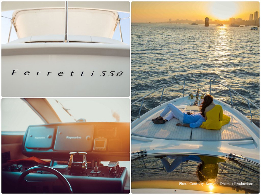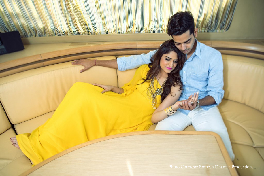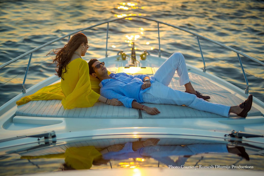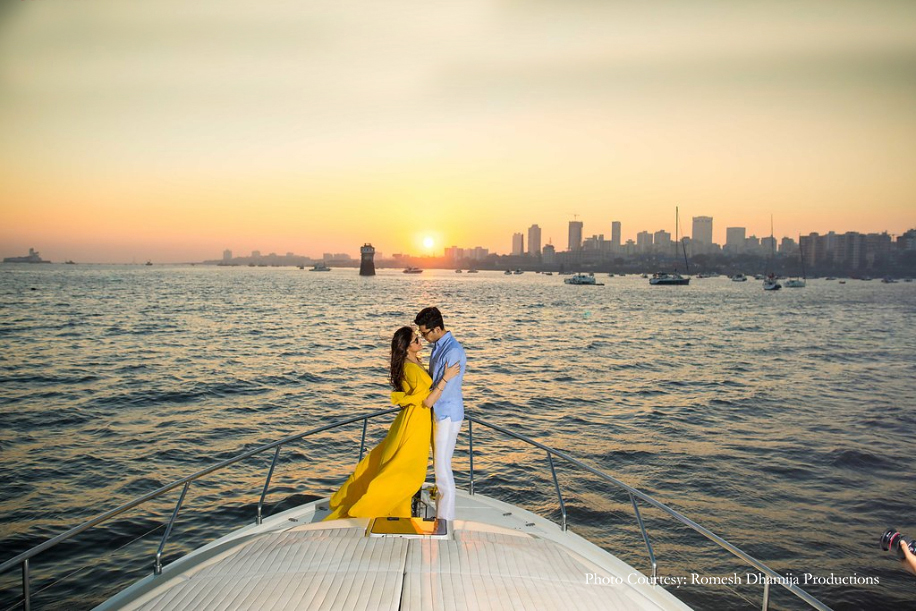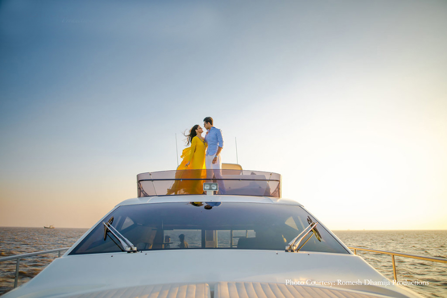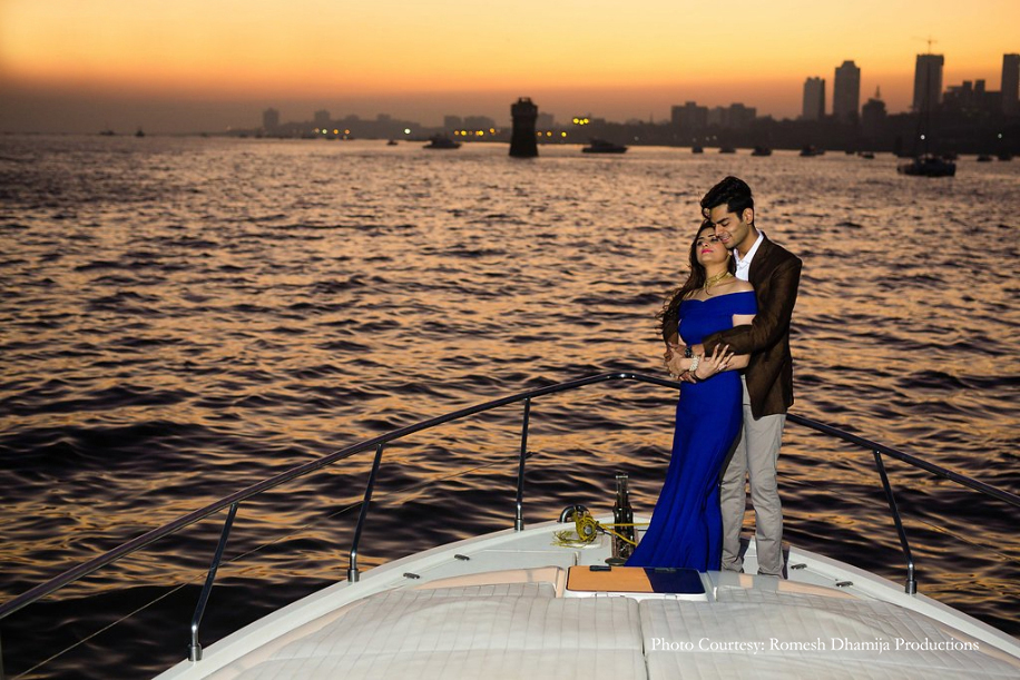 Imagine sharing sweet nothings with your partner on a yacht in the middle of the sea with nobody to disturb you! Shot by Romesh Dhamija Productions, Taran and Ronak’s mesmerizing pre-wedding shoot against the setting sun and Mumbai skyline resulted in unique frames. The team shares, “Taran & Ronak were very sure that they wanted a shoot which wasn’t ordinary. That did not leave many options in Mumbai as every location is quite overdone. We decided that we would keep the theme classy and glamorous. It wasn’t very difficult to plan this whole shoot as the bride is a designer herself so she took care of planning the clothes and color coordinating with the groom. Shooting on a moving yacht is no easy feat, but once you are in the sea the whole view, the amazing natural light and the beautiful location gets you hyped up. The only slight issue we faced is that the whole process of getting on to the yacht and reaching the venue took a little bit of time so we only got about an hour before the sun had set. We managed to get some beautiful moonlit shots too.”