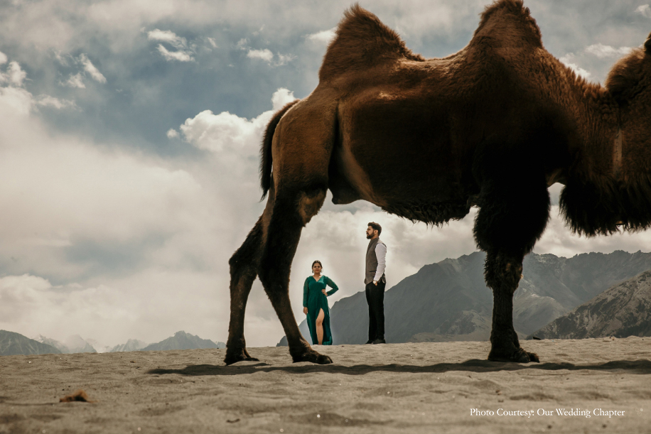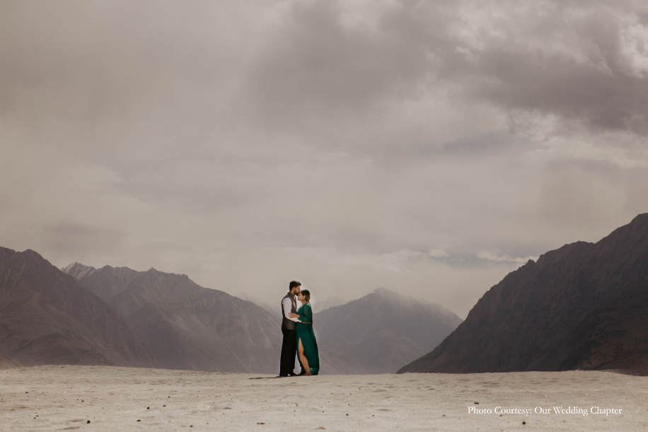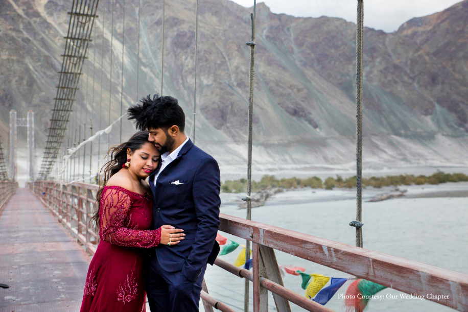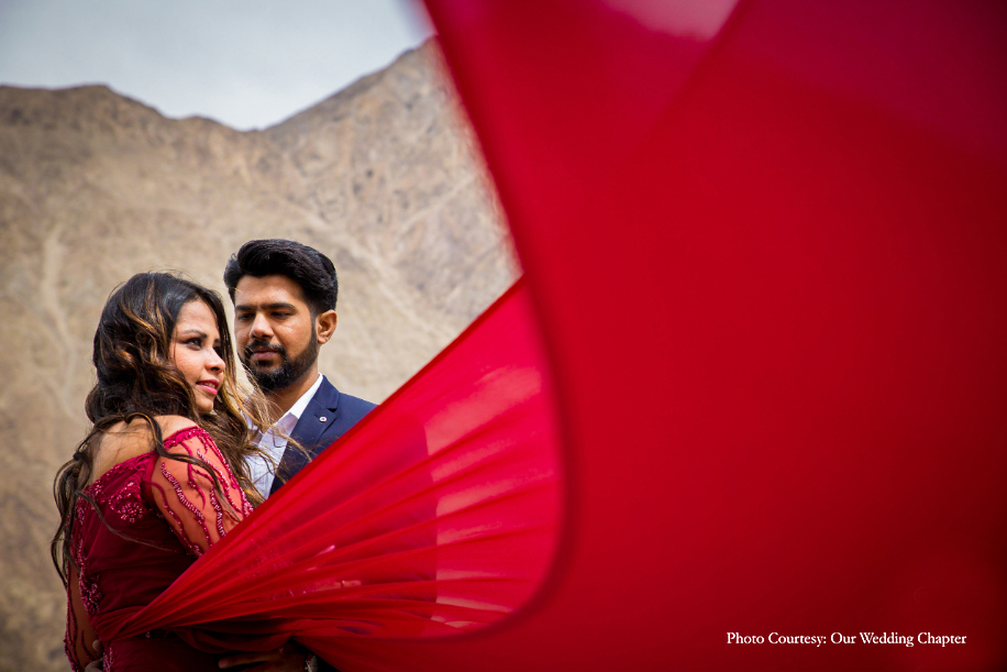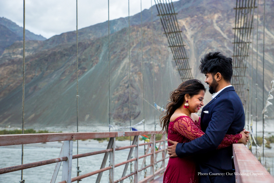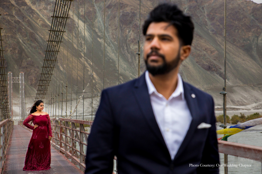 From the earthy hues of Ladakh’s rugged mountains to the seemingly endless, uncrowded roads in the region, every frame of Rahul and Shreya’s pre-wedding shoot captured by Our Wedding Chapter pays homage to the striking character of Ladakh. Contrasting elements such as Shreya wearing a fiery red gown and posing against the stark background enhance the dramatic mood. Stylish ensembles and lovely poses make the couple’s photo shoot a compelling one in a charming location.