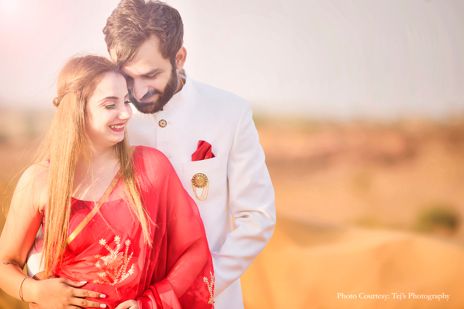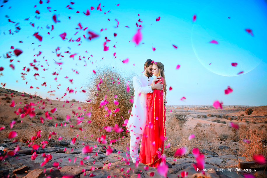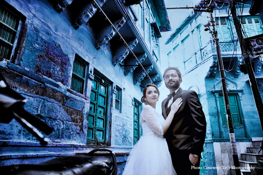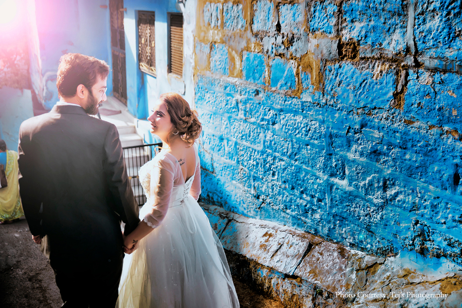 It’s a rare move to combine a surreal fantasy theme and classic Jodhpur backdrops in a pre-wedding photo shoot, but Neelam and Nakul’s results show how both aspects balanced out beautifully. Team Tej’s Photography share a little about the couple and the choice of their theme and location, “The idea was to shoot a couple photographs that combined the hues of Jodhpur – basically, the blues and the desert ochre that Jodhpur is well known for – with a bit of fantasy inspired getups. The process involved detailing out each look, the layout and poses that would complement the personalities of the couple, and planning out the themes. It sounds so technical, but once we started, it went from being a planned shoot to being a ball with the couple. After all, it’s all about having fun.”