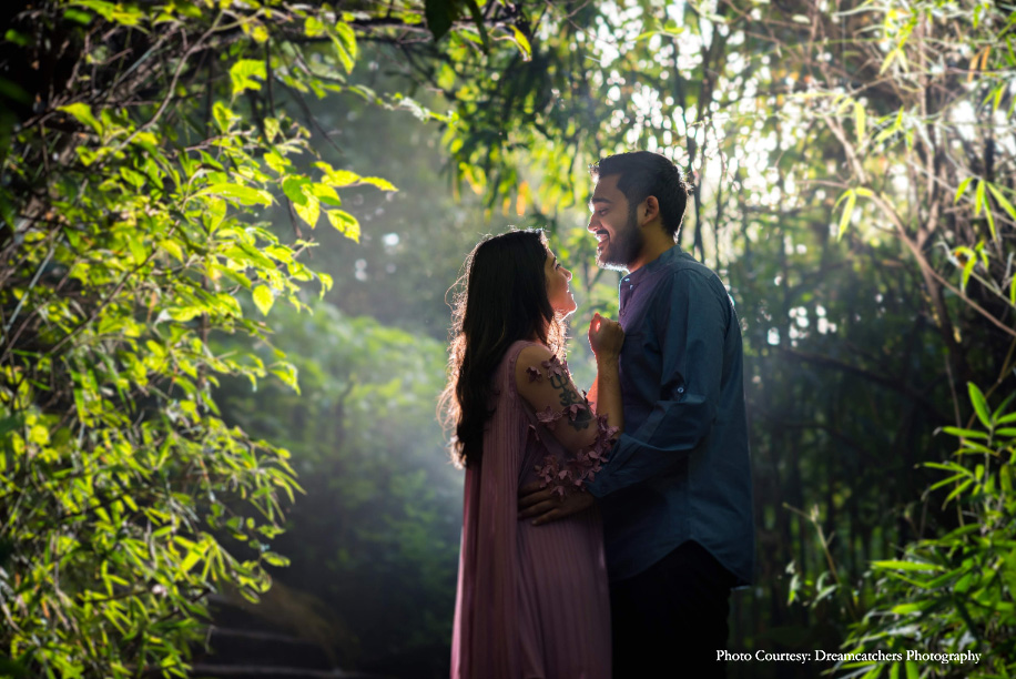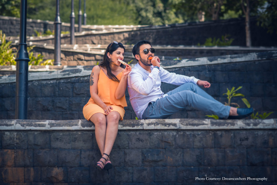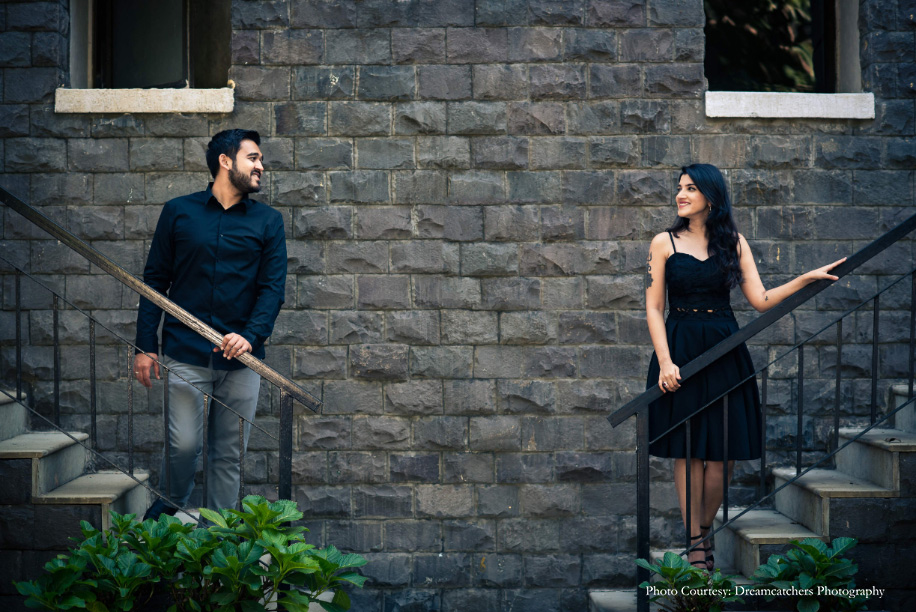 Avid travelers and foodies, Richa and Khushil chose Lavasa for their pre-wedding shoot shot by Dreamcatchers Photography. The couple explains, “We grew up in the UAE and so a trip to India was never ‘going back home’. It was always a new adventure, a new place to visit, a new regional dish to try. We wanted to surprise our friends and family with the scenic views, colorful buildings and clear skies of the mini Europe of Maharashtra.” The couple managed to portray their connection and love against two backdrops by capturing moments of their romance amidst the beautiful surroundings.