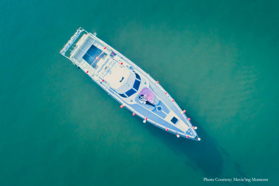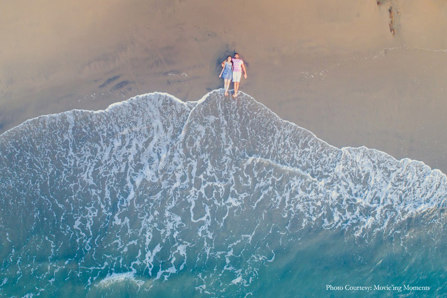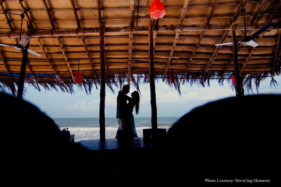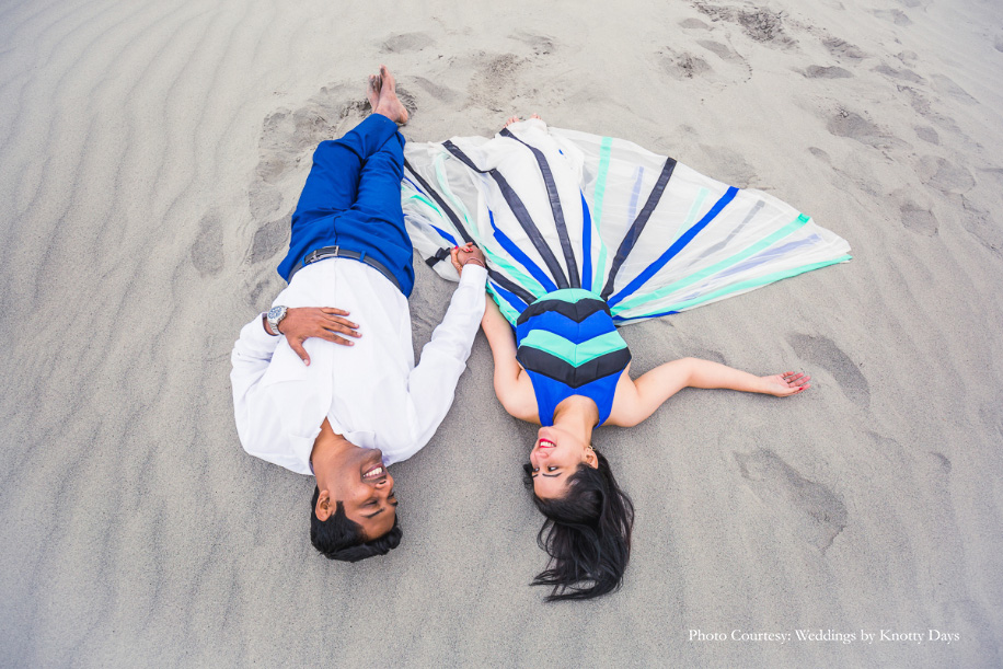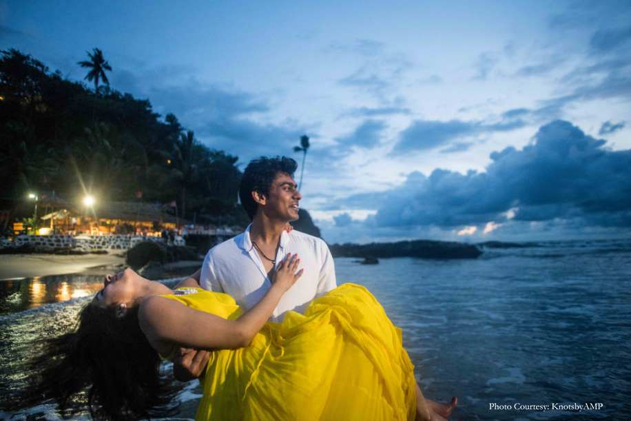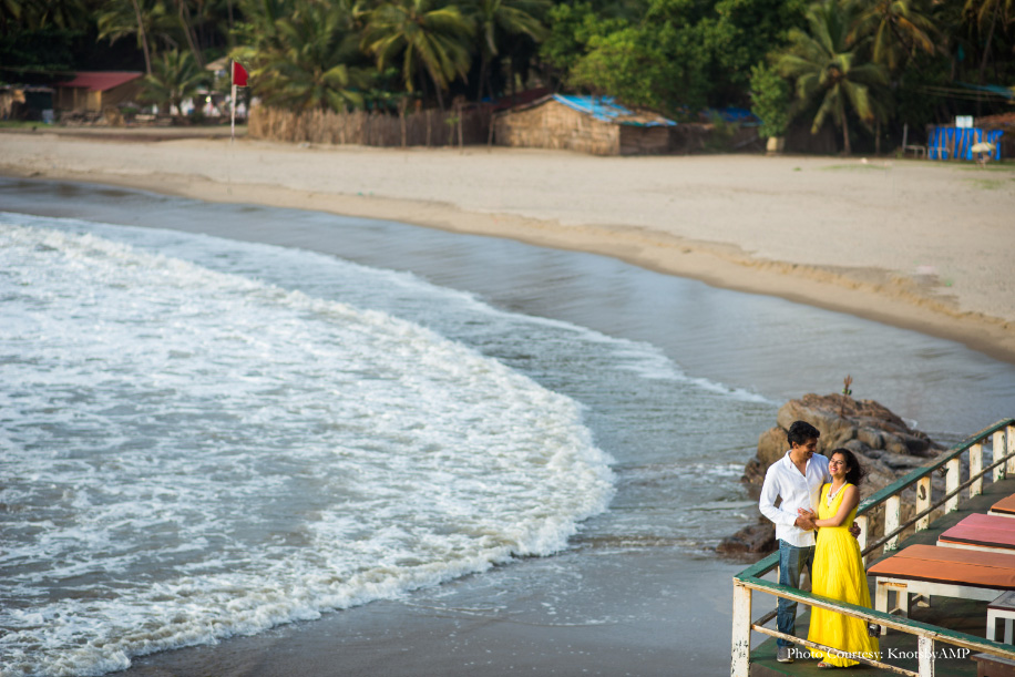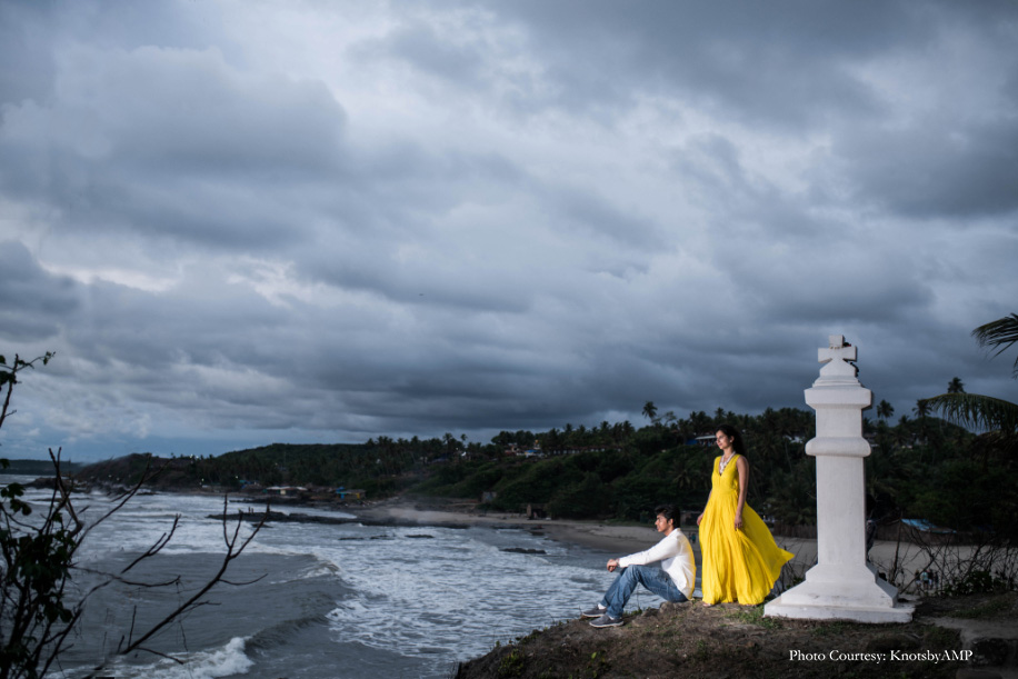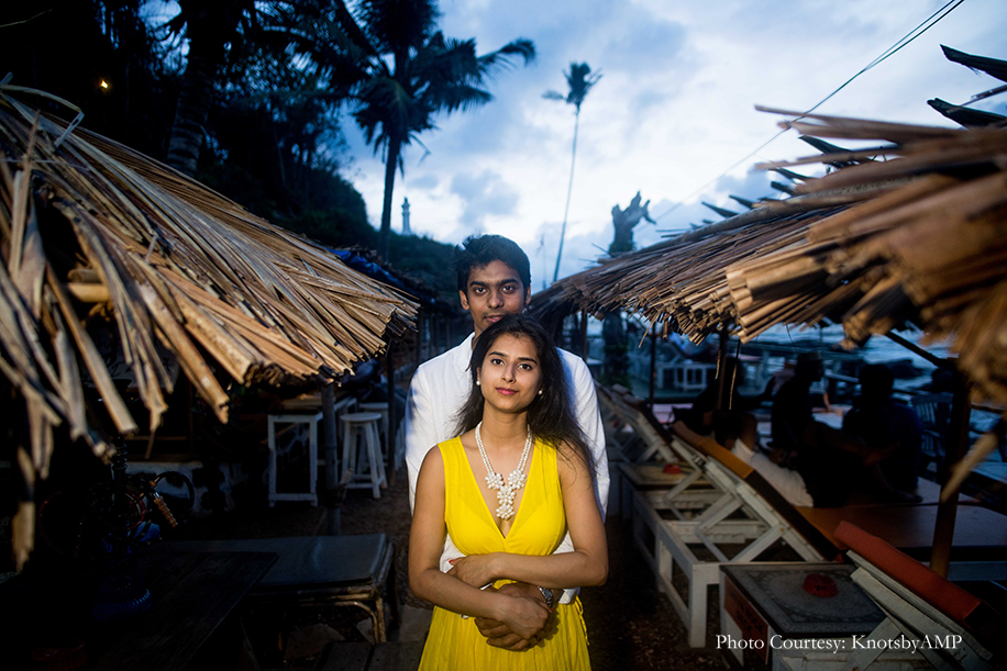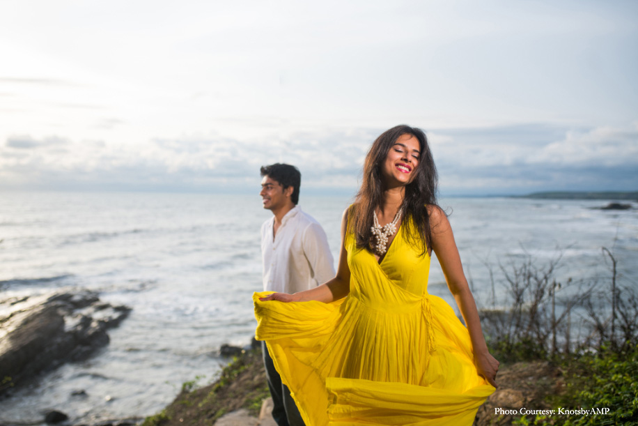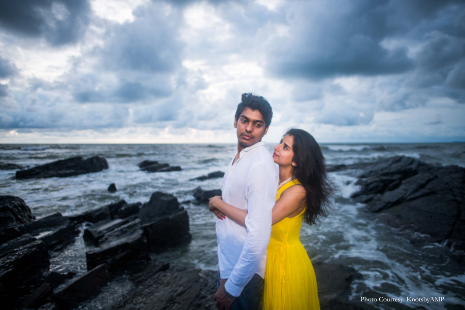 Sai and Trupti made the most of their tropical destination, Ozran Beach in Goa. “This is one of the few beaches in North Goa which is secluded from the crowd and the hustle-bustle,” they said, “There are rocks, cliffs and it is surrounded with palm trees, so this was the ideal place for us. As the shoot progressed, the weather started changing and beautiful clouds appeared. The whole scene was magical.” Each frame is replete with tropical magic and Trupti’s yellow gown stood out and added more charm to the pre-wedding shoot shot by KnotsbyAMP.