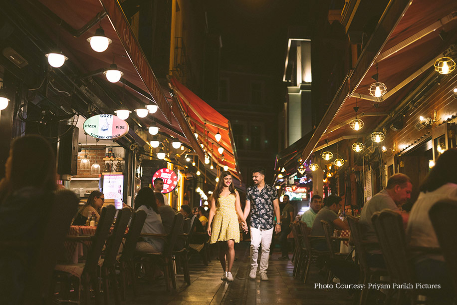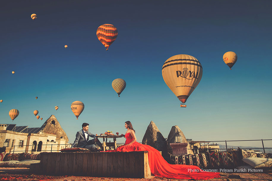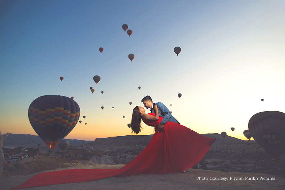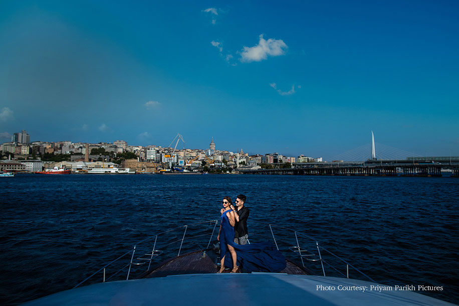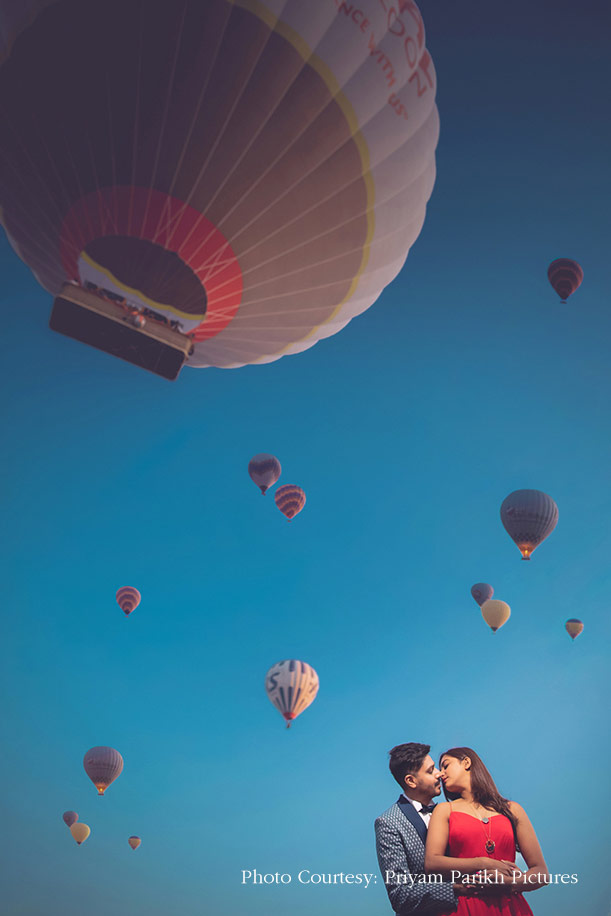 Like a shot straight out of a Bollywood film, Suhani and Parth’s pre-wedding photoshoot features one of the world’s most recognizable fairytale backdrops – the hot air balloons rising over the landscape of Cappadocia. Team Priyam Parikh Pictures managed to capture the couple’s romance in that gorgeous setting. More pictures, this time in the streets of mystical Istanbul and before the blue waters of the Bosphorous which were conceptualized by 7X Weddings.