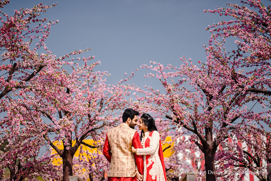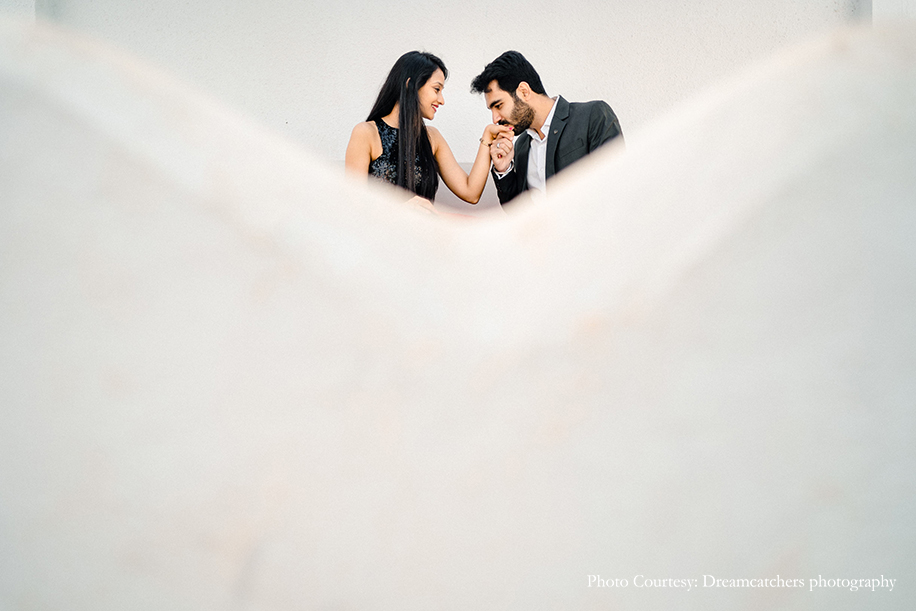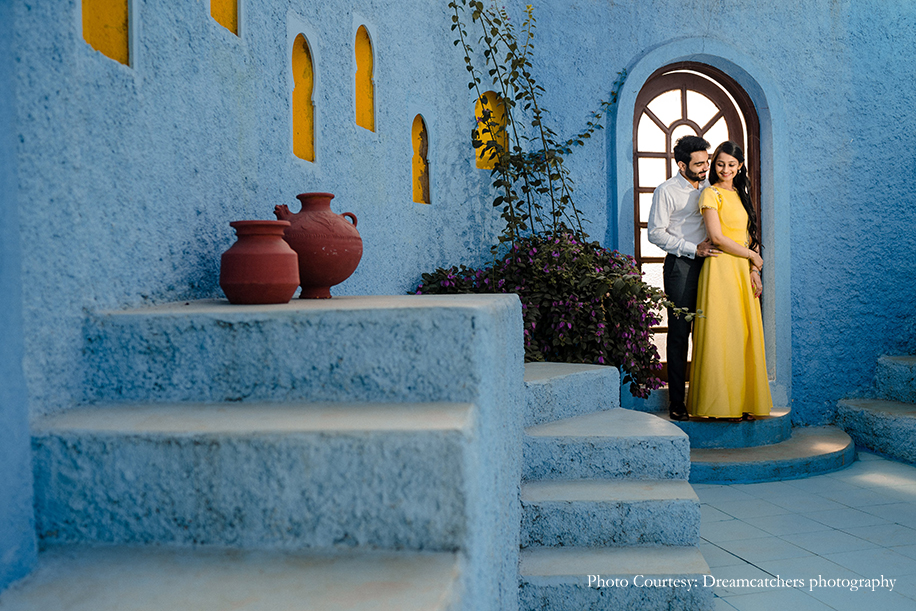 A plethora of gorgeous backdrops at Sets in the City, a set design company in the outskirts of Mumbai, made for intriguing backdrops for Varsha and Mitesh’s photoshoot. From glorious royal palace halls to the colorful facade of Morocco, and the quaint white and blue streets of European towns, these beautiful shots by Dreamcatchers Photography takes viewers on a riveting visual journey.